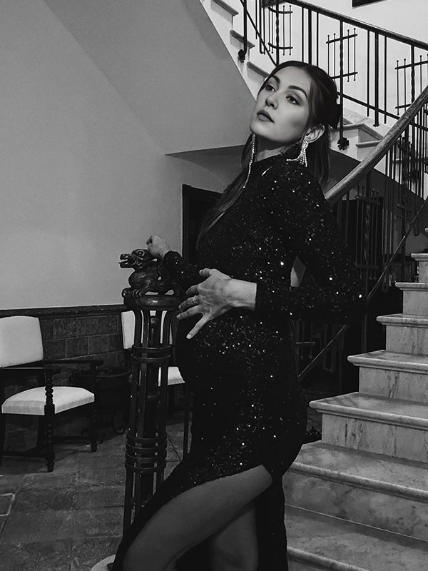 fotobeyou Glitter Full Sequin Side Slit Backless High Neck Bodycon Elegant Maternity Photoshoot Maxi Dress