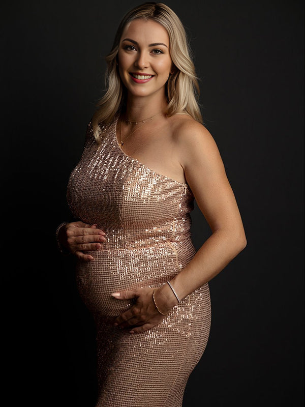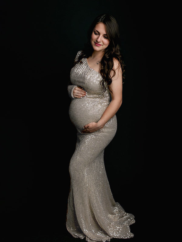 fotobeyou Glitter Sequin One Shoulder Mermaid Elegant Christmas Evening Gown Maternity Photoshoot Maxi Dress
