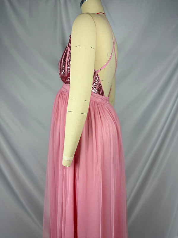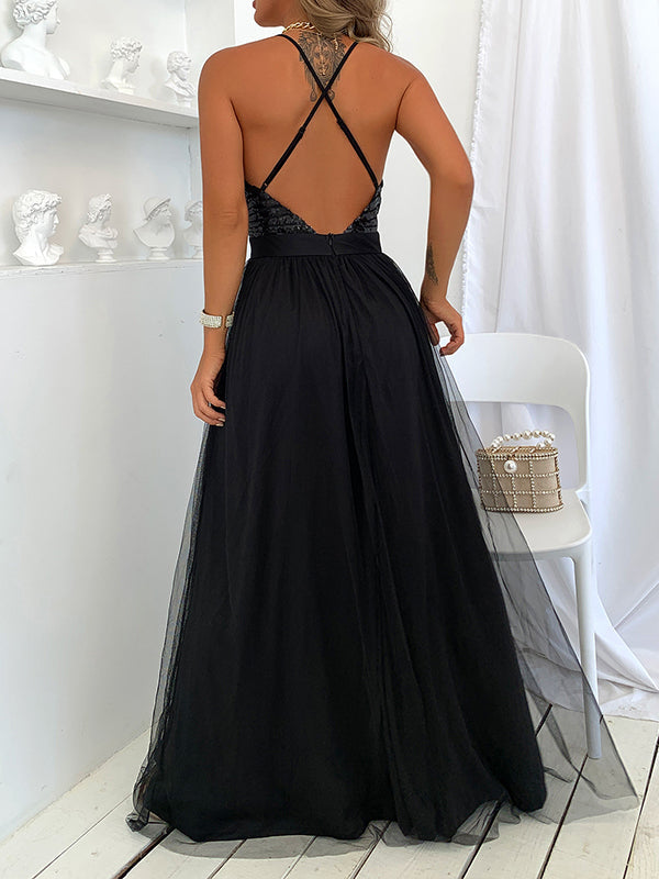 Decoration: Sequin, tulle, side slits, big swing, cami, backless, spaghetti strap