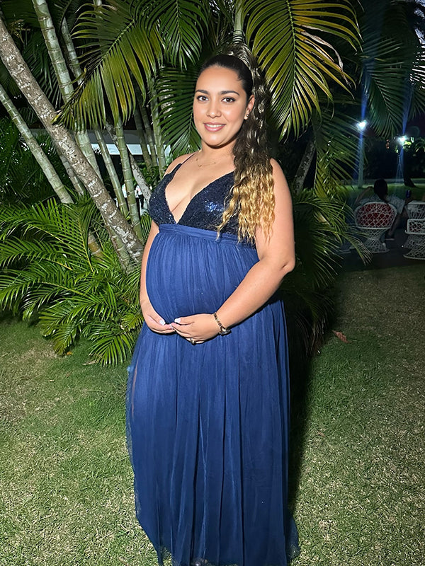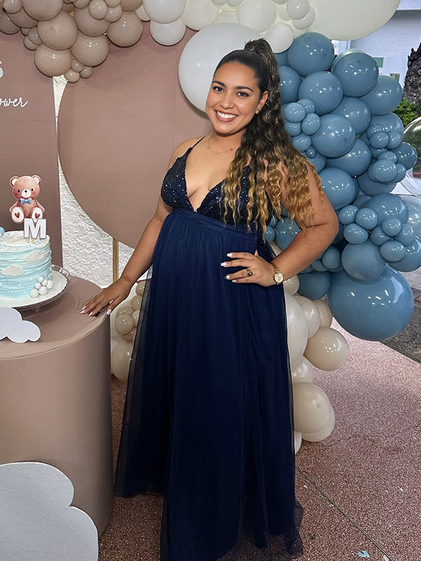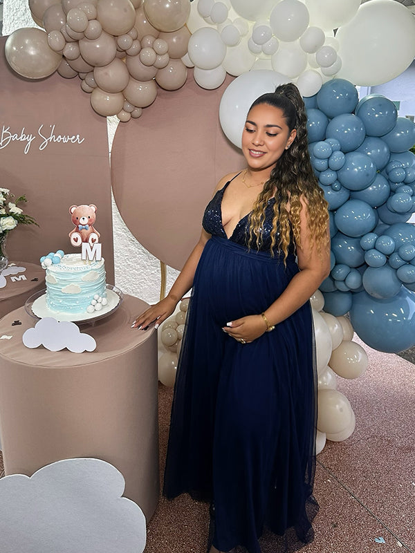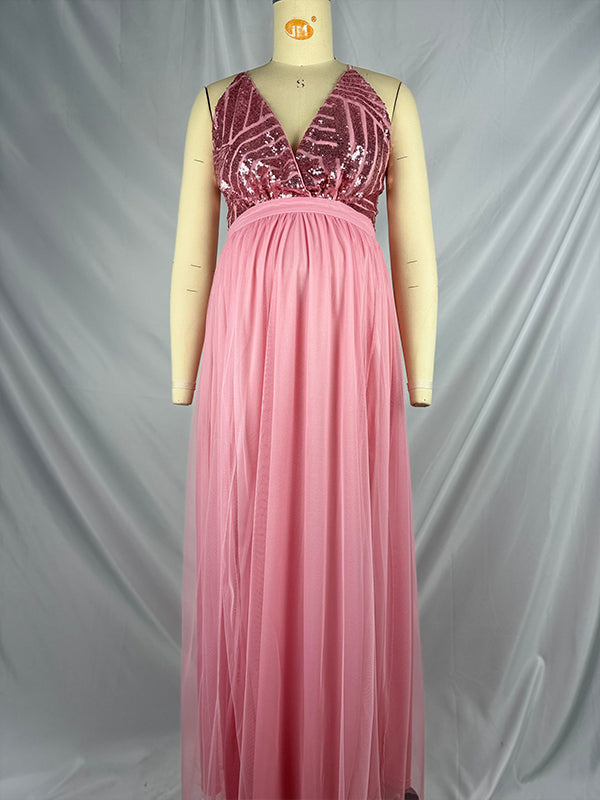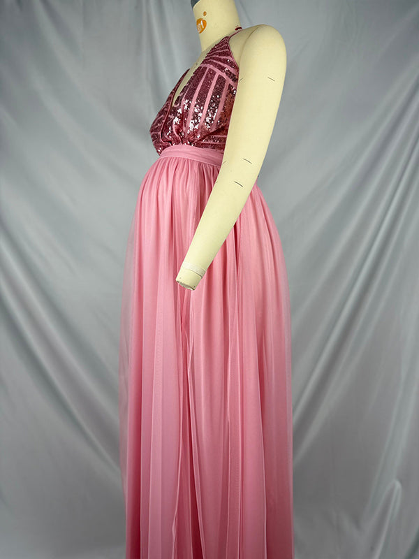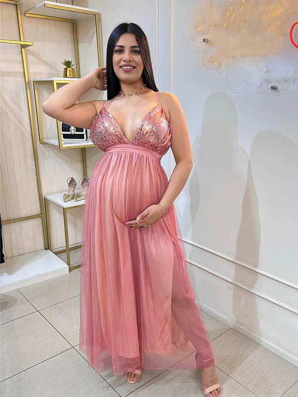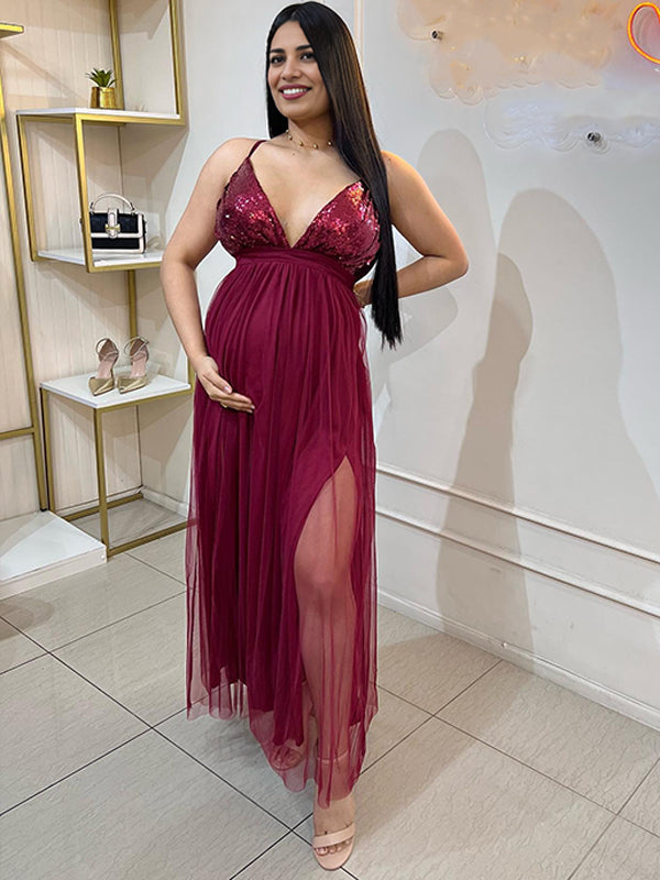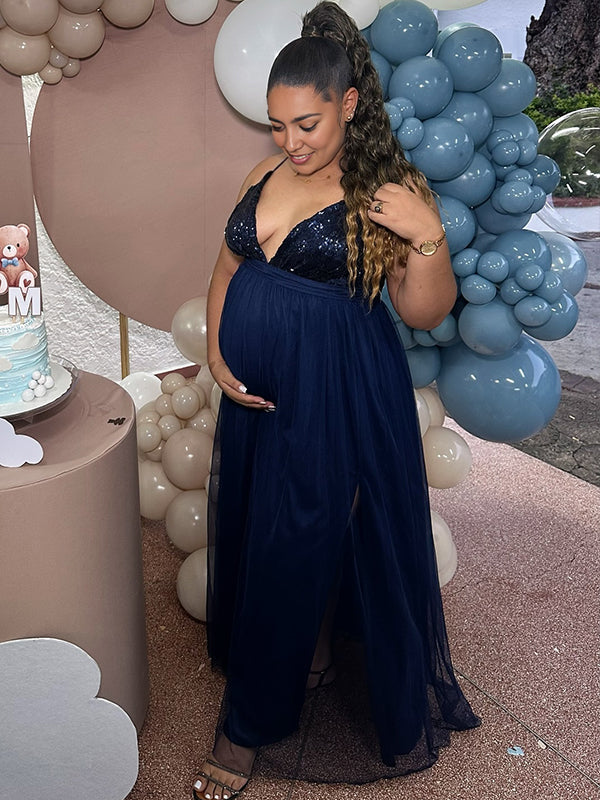 fotobeyou Glitter Sequin Tulle Side Slits Big Swing Cami Backless Elegant Maternity Baby Shower Maxi Dress