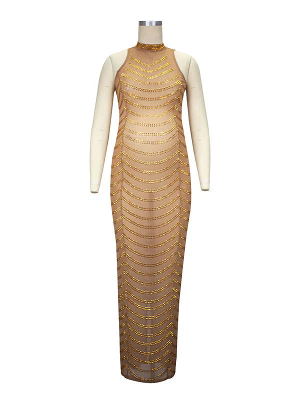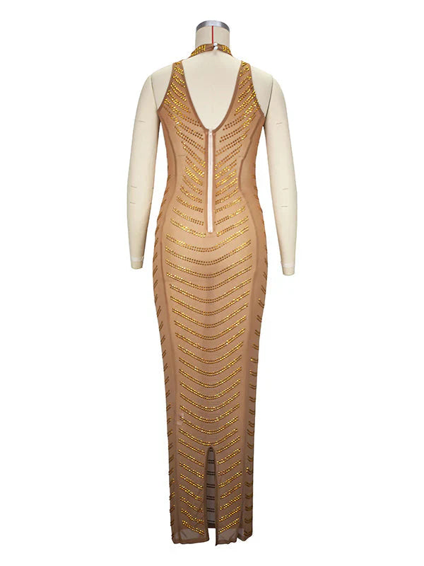 fotobeyou Gold Rhinestone Mesh Sleeveless Backless Photoshoot Bodycon Evening Plus Size Maternity Maxi Dress