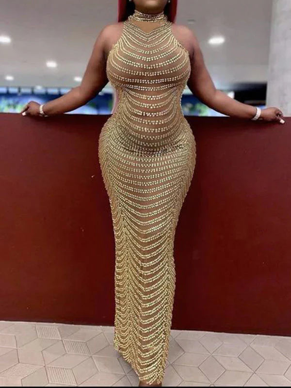 - Feature: Chic Rhinestone, Sparkle, Mesh See Through, Spaghetti Strap, Wrap Dress, Back Zip, Slim Fit,?Bodycon Maxi Dress, Club Party Outfit.