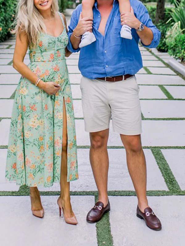fotobeyou Green Floral Side Slit Ruffle Bow Flowy Back Zipper Photoshoot Baby Shower Maternity Maxi Dress