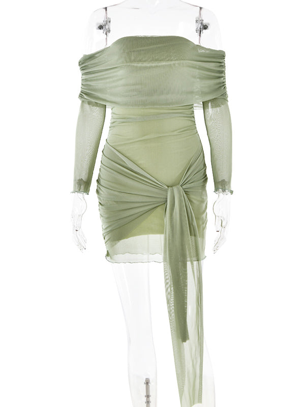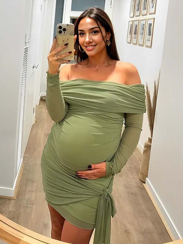 fotobeyou Green Mesh Ruched Knot Draped Off Shoulder Bodycon Elegant Cocktail Party Maternity Photoshoot Baby Shower Mini Dress