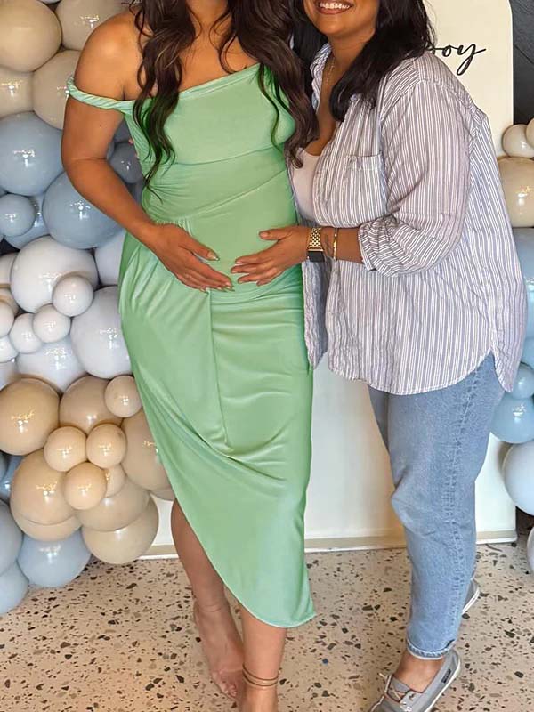 fotobeyou Green One Shoulder Irregular Ruched Side Slit Maternity Midi Dress