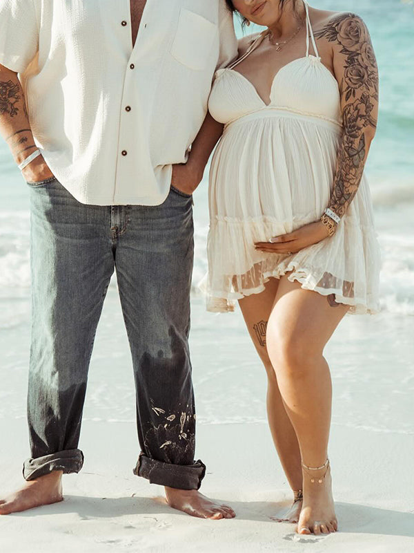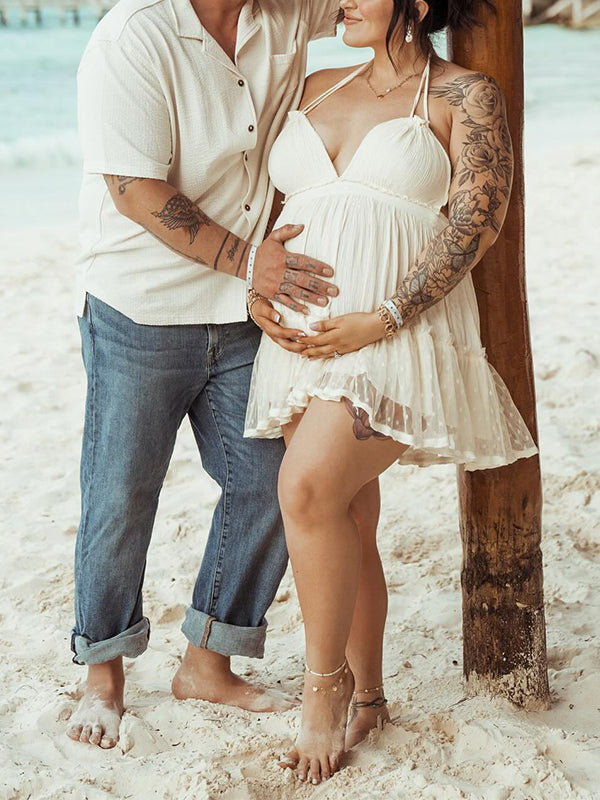 fotobeyou Halter Neck Backless Mesh Splicing V-Neck Boho Photoshoot Maternity Mini Dress