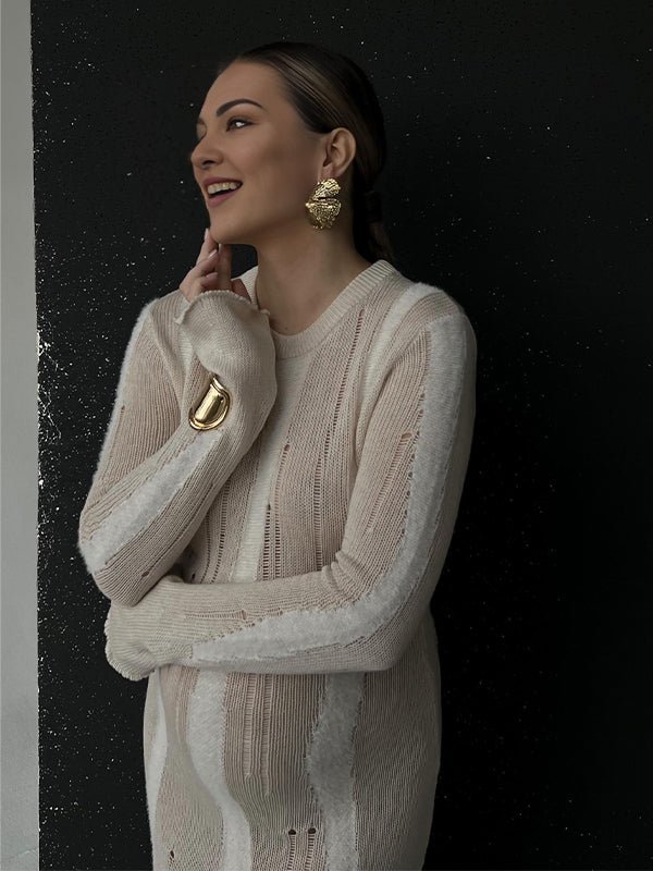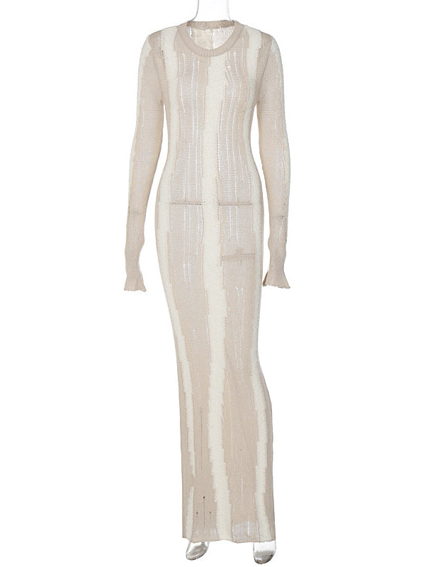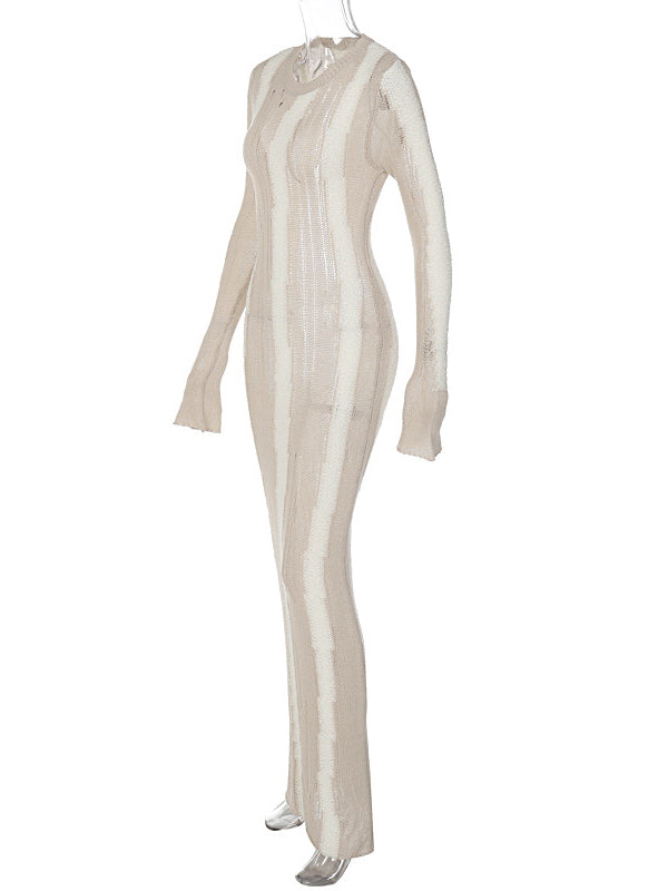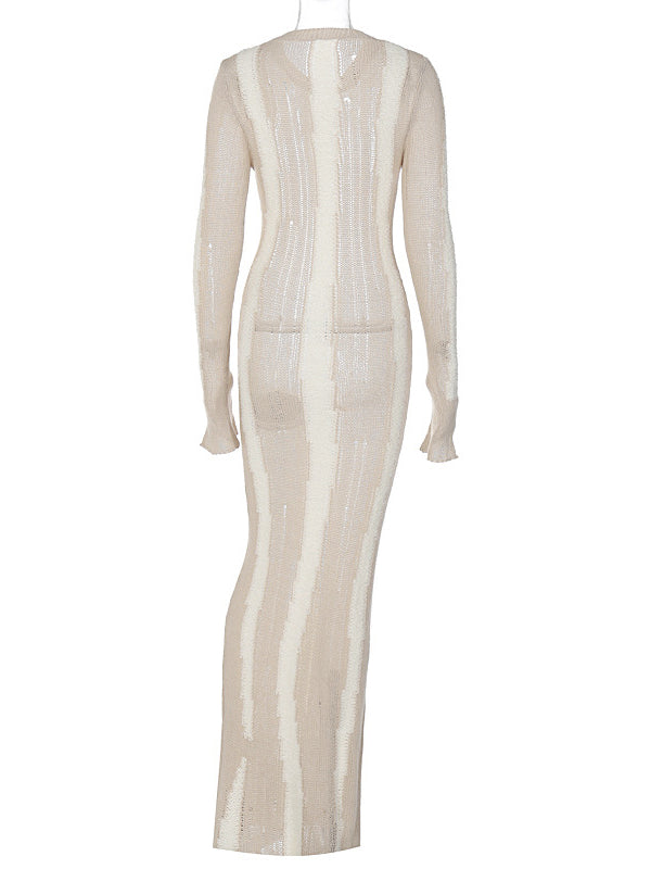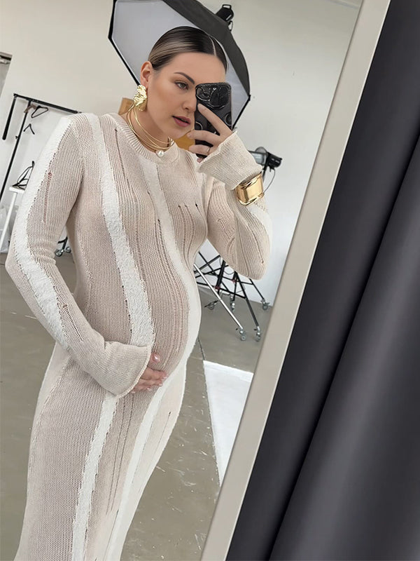 fotobeyou Khaki Knit Striped Cut Out Flare Sleeve Bodycon Photoshoot Baby Shower Maternity Maxi Sweater Dress