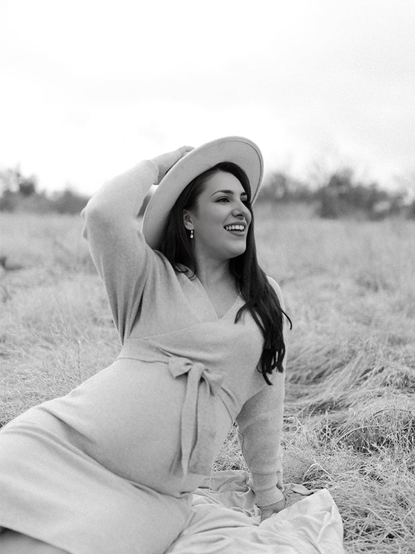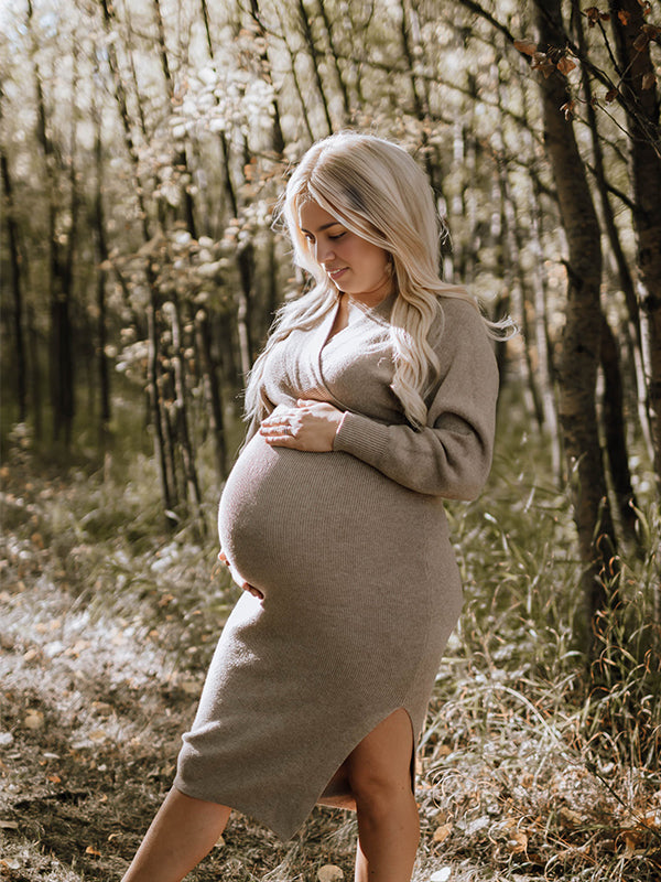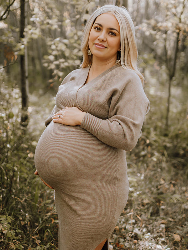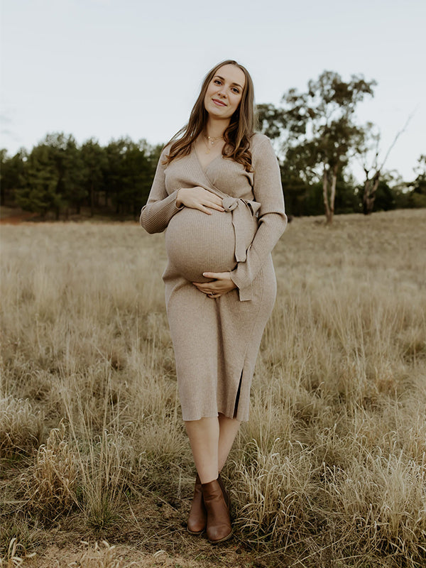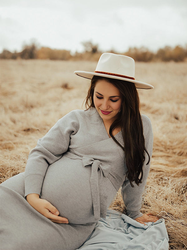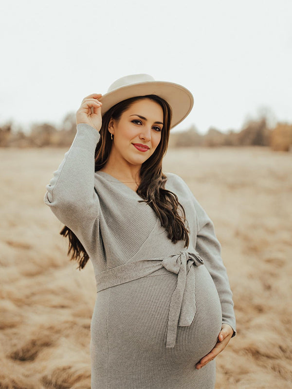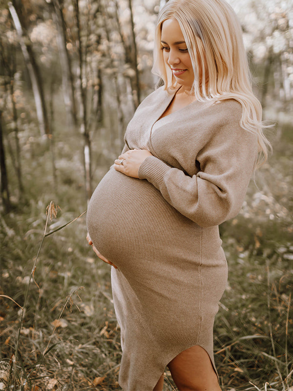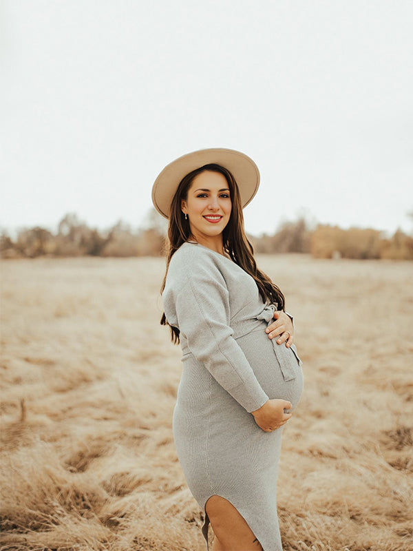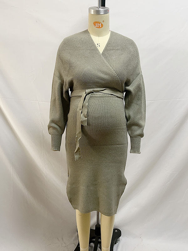fotobeyou Knit Solid Color Sashes V-Neck Double Split Backless Bodycon Photoshoot Maternity Sweater Midi Dress