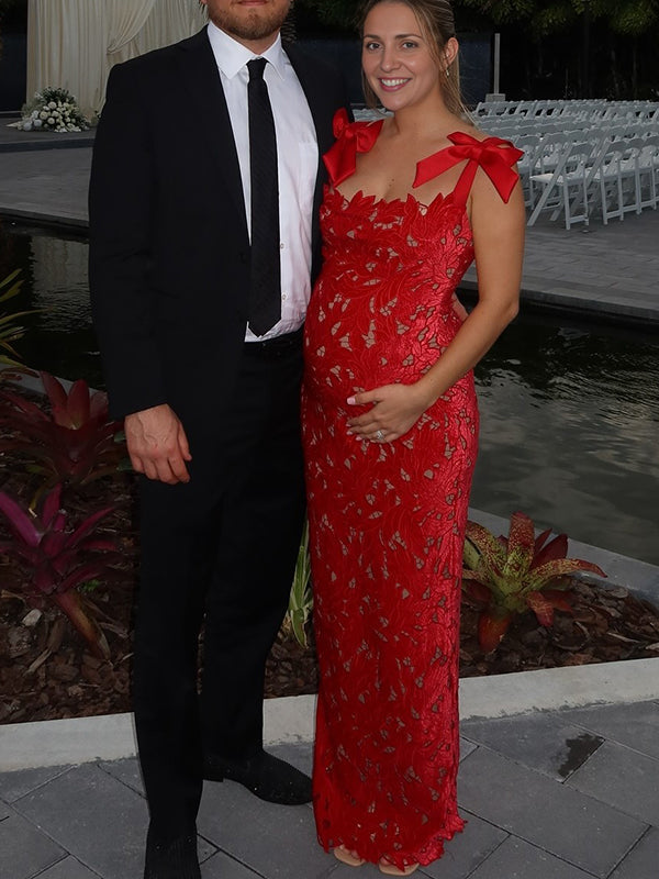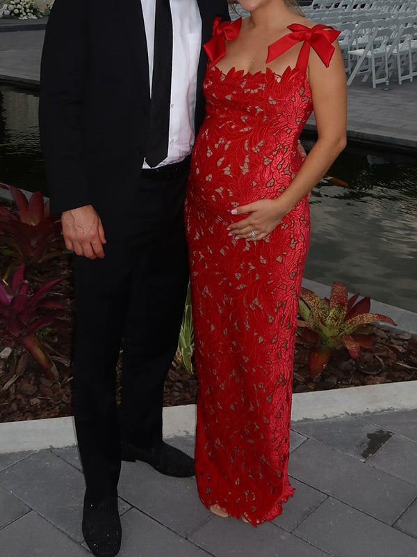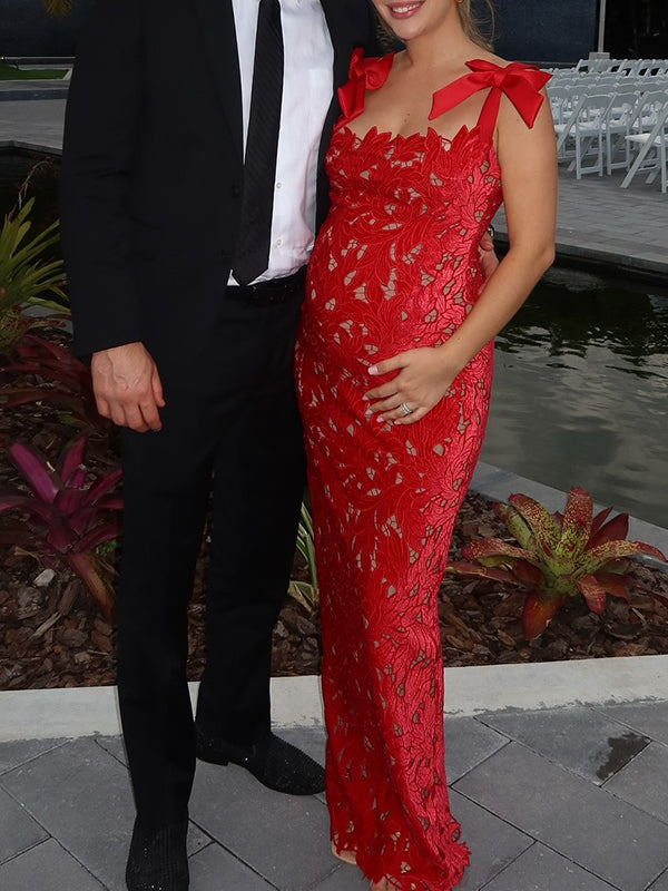 Fotobeyou Lace Hollow Out Bow Tie Shoulder Strap Back Slit Maternity Maxi Dress