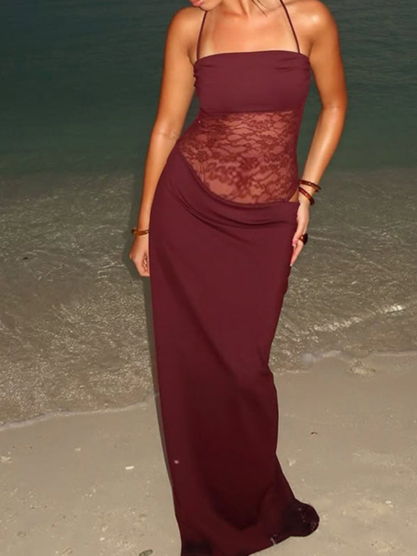 fotobeyou Lace Ruched Tie Shoulder Strap Cami Chic Maternity Baby Shower Maxi Dress