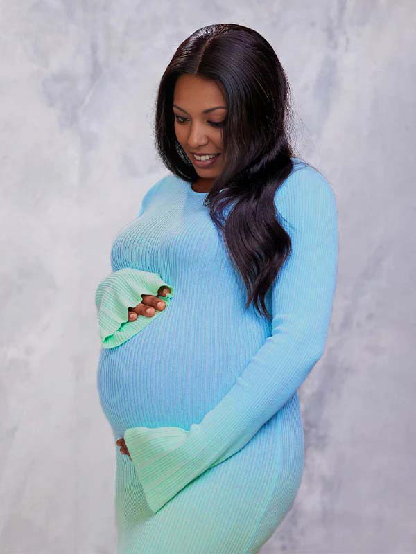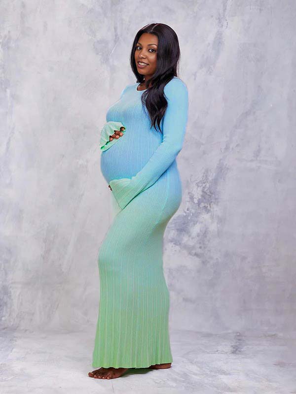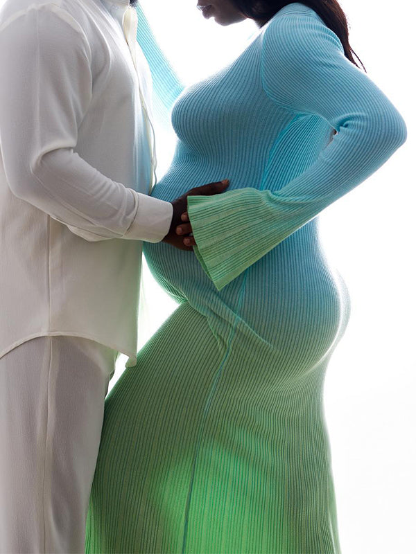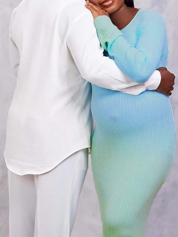 fotobeyou Light Blue Hit Color Flare Sleeve Mermaid Elegant Photoshoot Baby Shower Maternity Maxi Sweater Dress