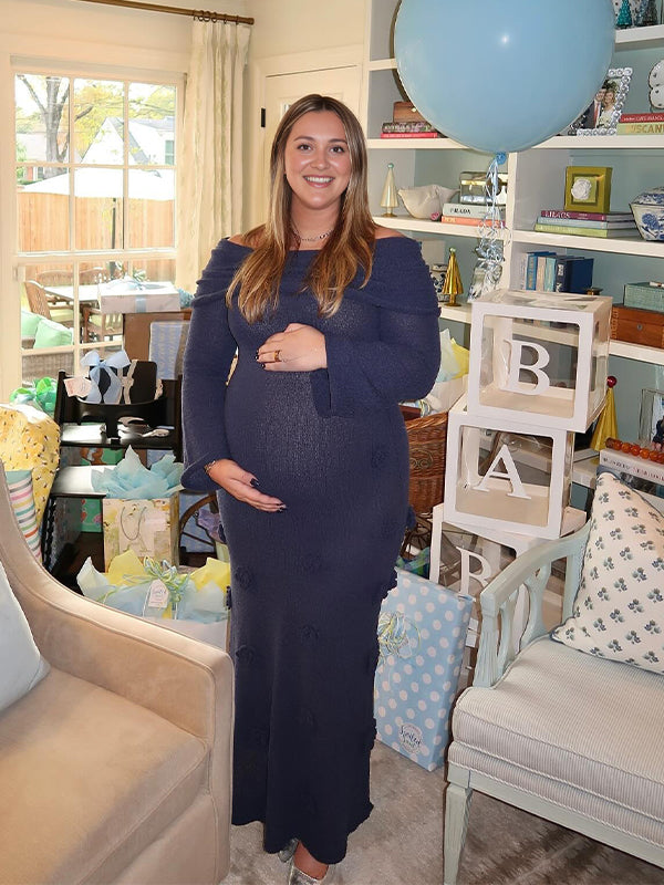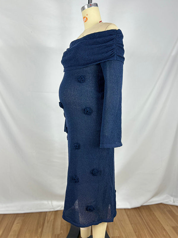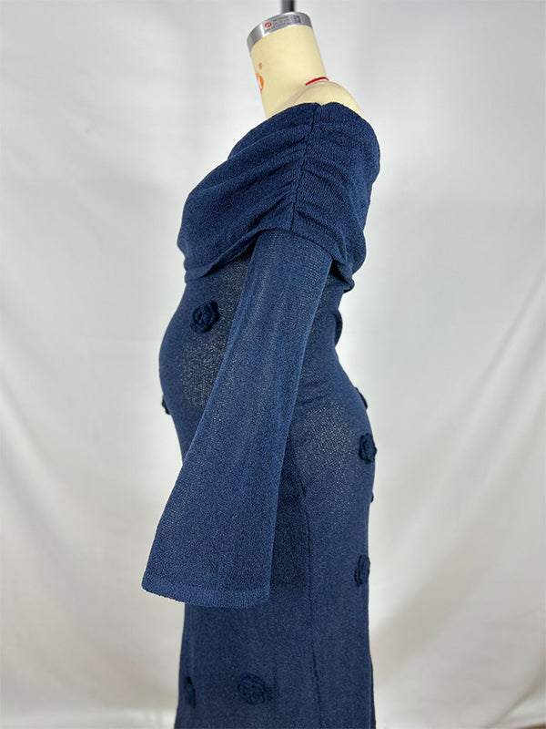 fotobeyou Navy Blue Off Shoulder 3D Flowers Flare Sleeve Mermaid Bodycon Photoshoot Baby Shower Maternity Maxi Dress