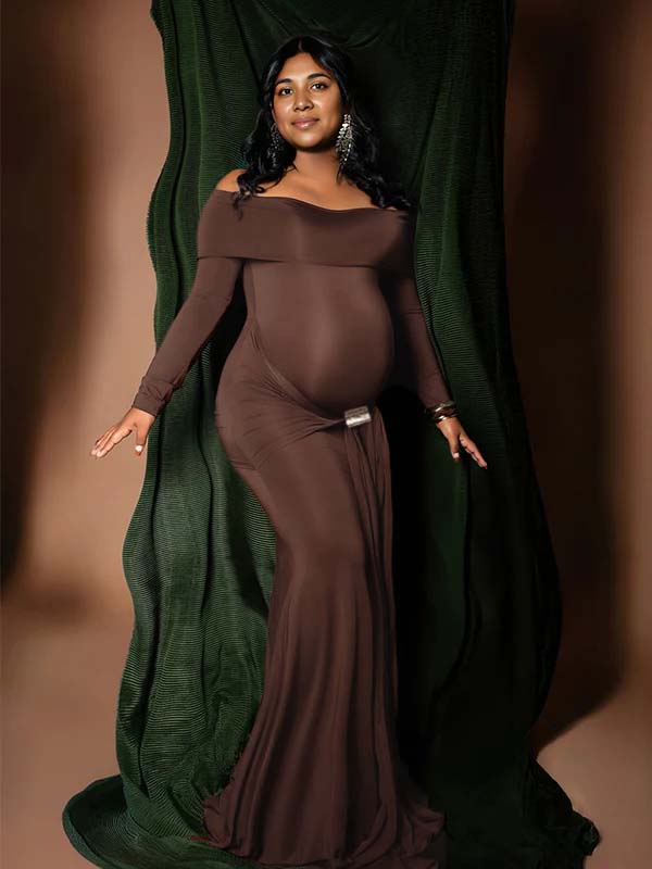 fotobeyou Off Shoulder Draped Ruched Metal Buckle Bodycon Elegant Maternity Photoshoot Maxi Dress