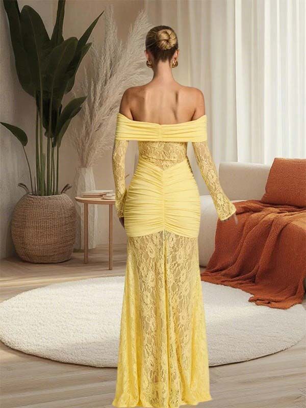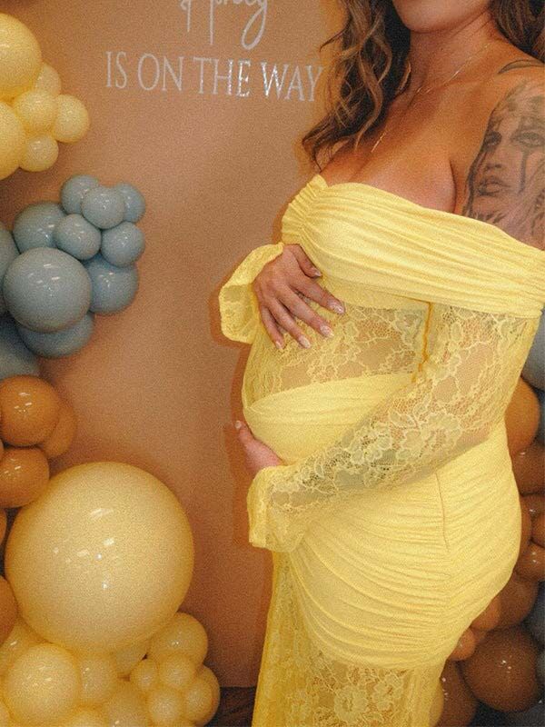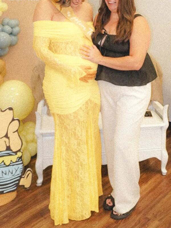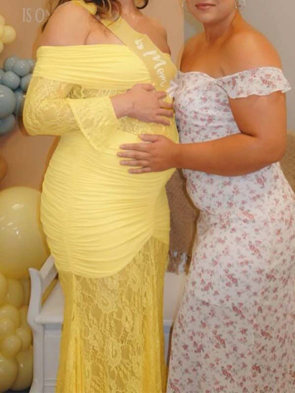 fotobeyou Off Shoulder Lace Ruched Mermaid Baby Shower Maternity Maxi Dress