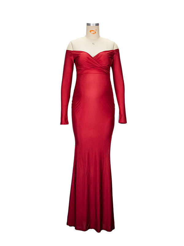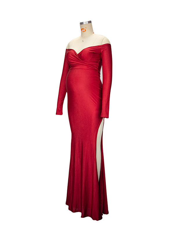 fotobeyou Off Shoulder Long Sleeve Slit Bodycon Solid Baby Shower Party Evening Gown Maternity Maxi Dress