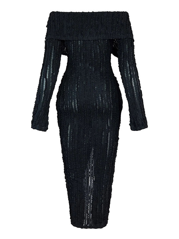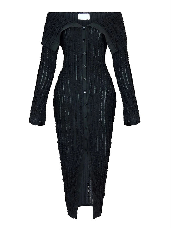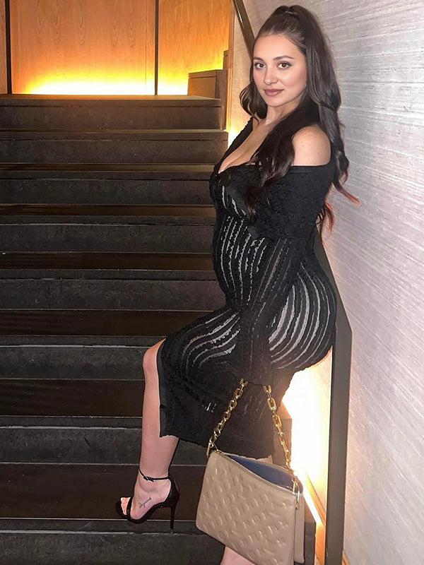 fotobeyou Off Shoulder Single Breasted Mesh Wavy Ruffle Front Slit Bodycon Elegant Going Out Maternity Baby Shower Maxi Dress