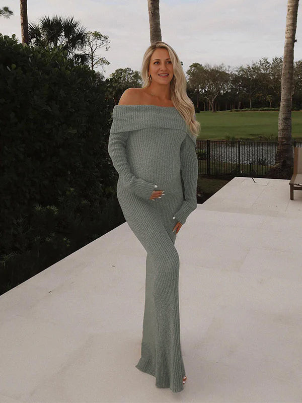 fotobeyou Off Shoulder Solid Color Mermaid Bodycon Elegant Photoshoot Maternity Maxi Sweater Dress