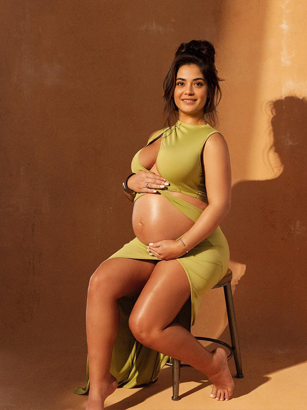 fotobeyou Olive Cut Out Irregular Split Ruffle Side Slit Bodycon Chic Photoshoot Maternity Maxi Dress