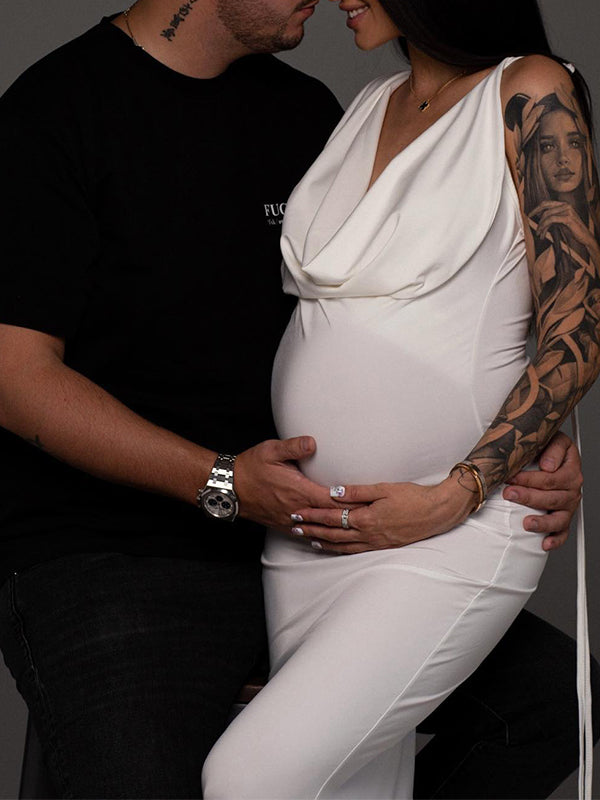 fotobeyou One Sleeve Backless Tie V-neck Bodycon Elegant Evening Photoshoot Gown Baby Shower Maternity Maxi Dress