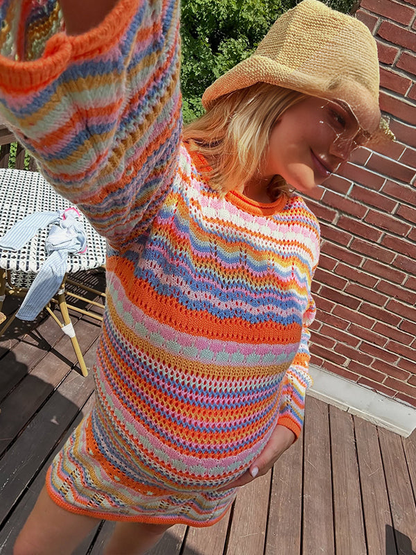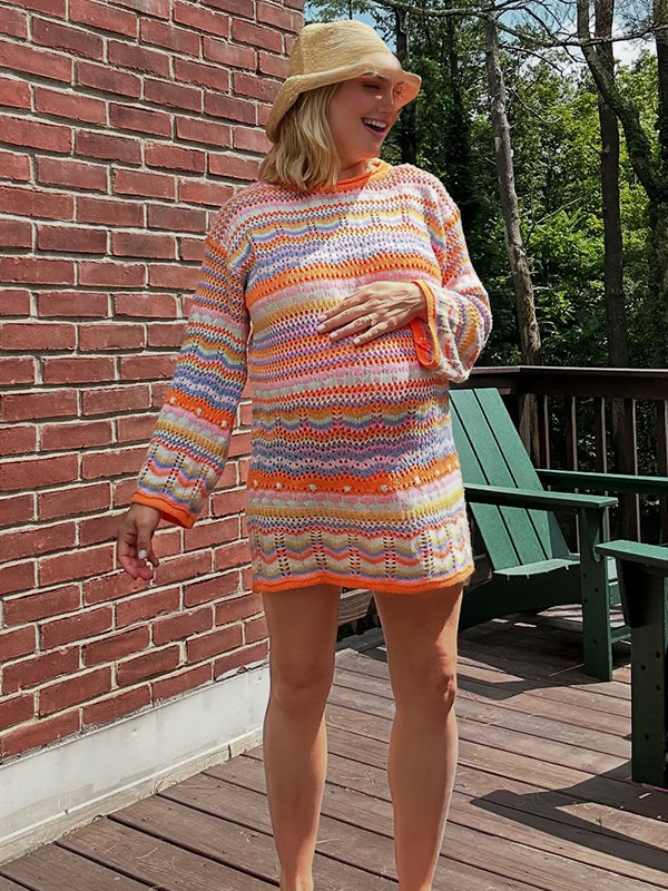 Fotobeyou Orange Round Neck Striped Crochet Maternity Sweater Mini Dress