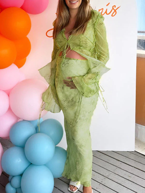 fotobeyou 2 Piece Mesh Print Ruffle Tie Slit Flare Sleeve Vacation Photoshoot Baby Shower Maternity Maxi Dress