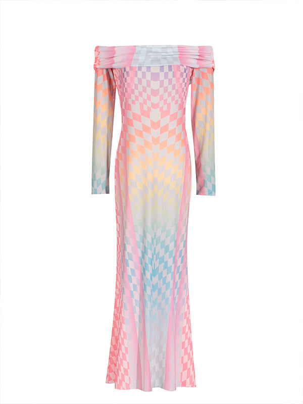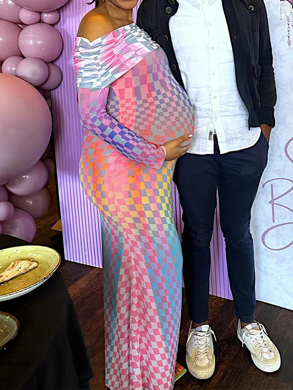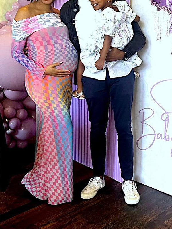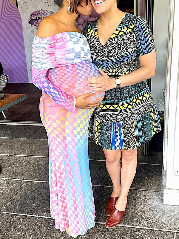 fotobeyou Pink&Blue Color Block Off Shoulder Bodycon Elegant Cocktail Party Chic Maternity Gender Reveal Maxi Dress