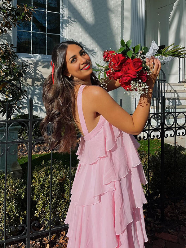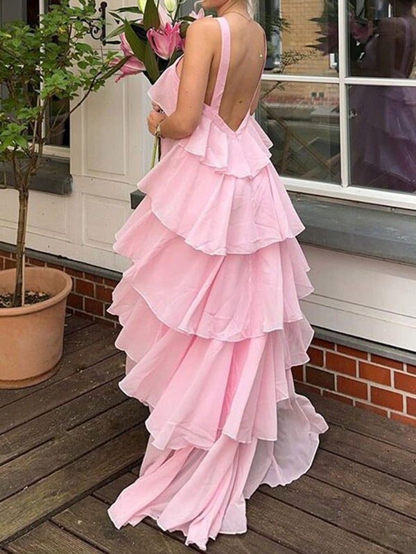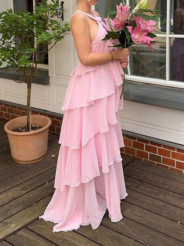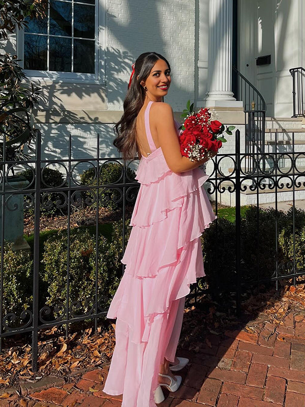 fotobeyou Pink Chiffon Tiered Ruffle Falbala Backless Prom Gown Elegant Maternity Photoshoot Maxi Dress