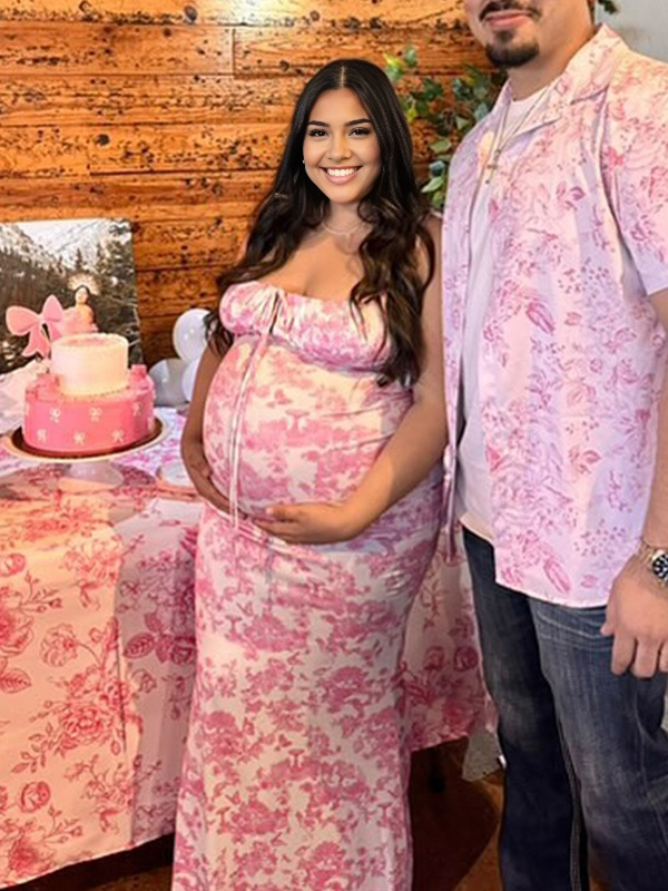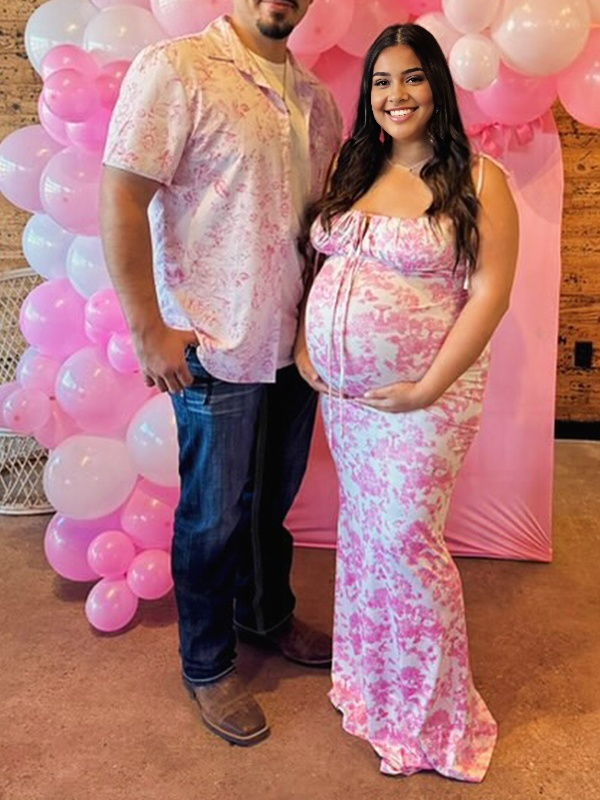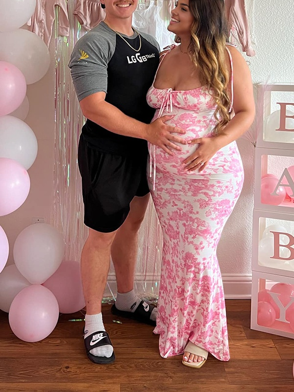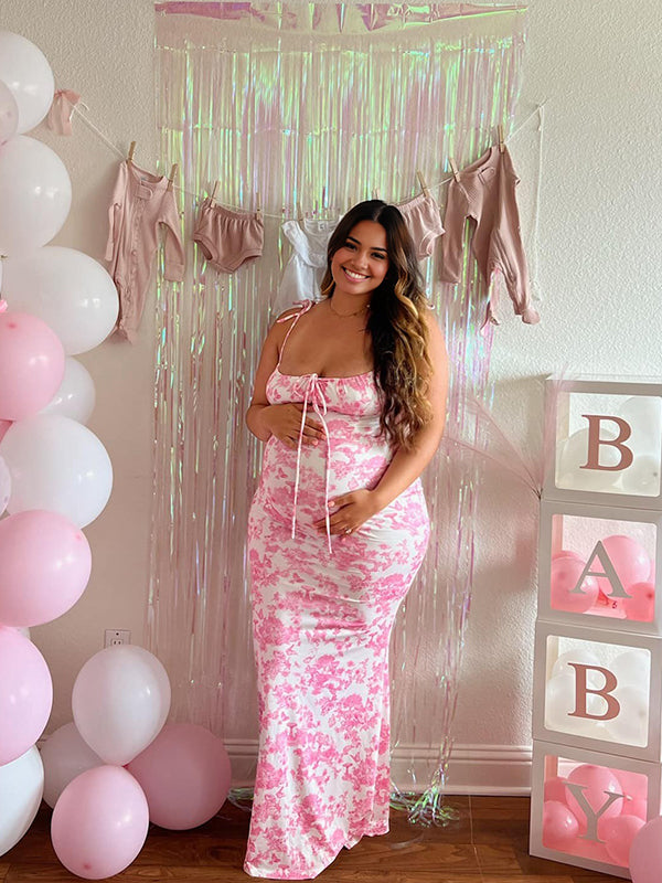 fotobeyou Pink Crushed Flower Spaghetti Strap lace-up Ruched Banquet Party Baby Shower Maternity Photoshoot Maxi Dress