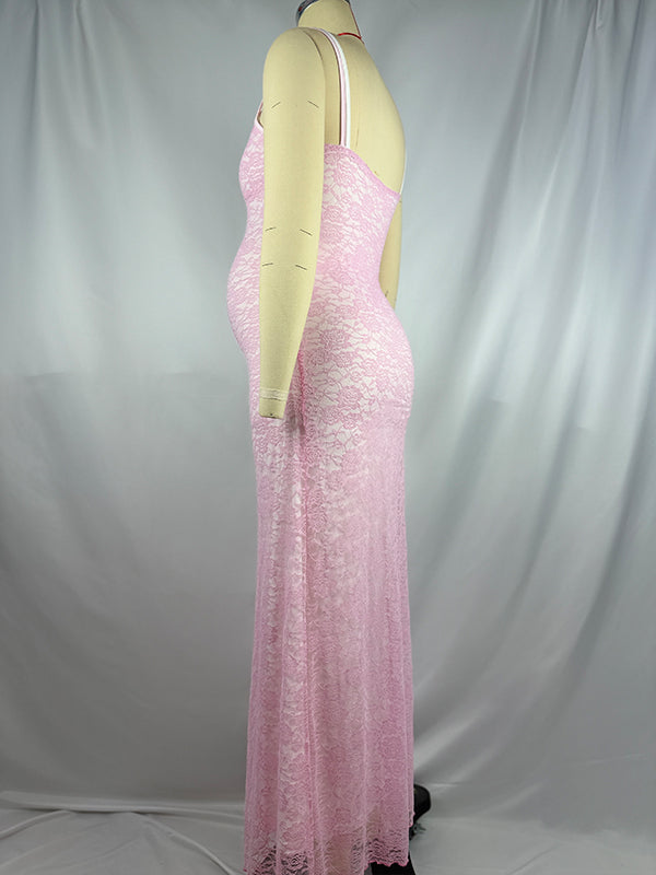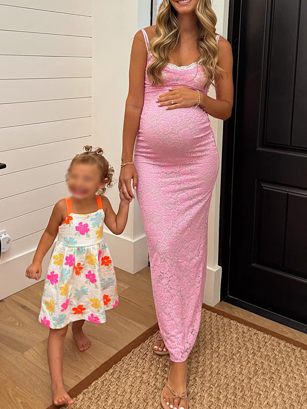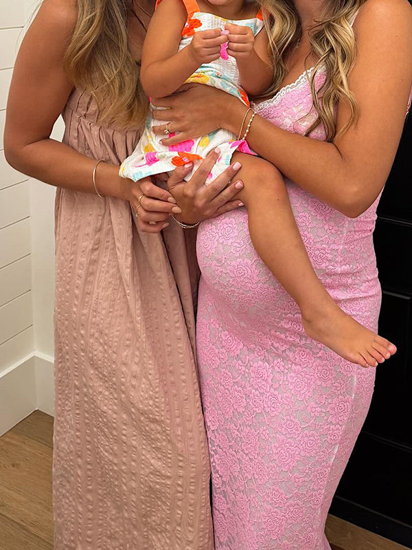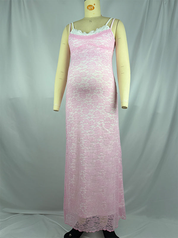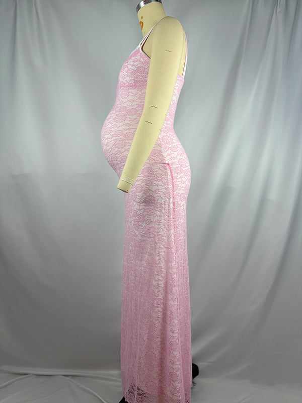 fotobeyou Pink Hit Color Lace Cami Elegant Maternity Maxi Dress