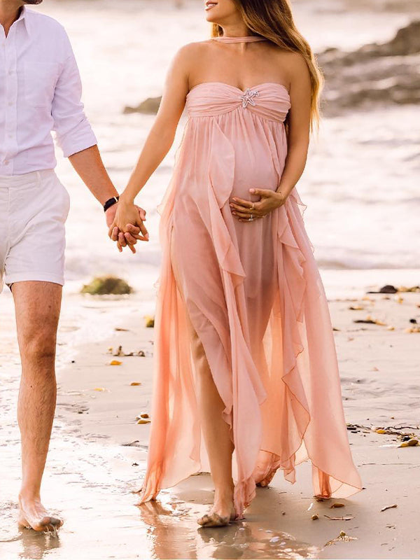 fotobeyou Pink Irregular Ruffle Halter Neck Backless Flowy Elegant Vacation Beach Photoshoot Gender Reveal Girl Baby Shower Maternity Maxi Dress