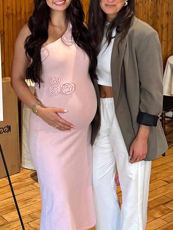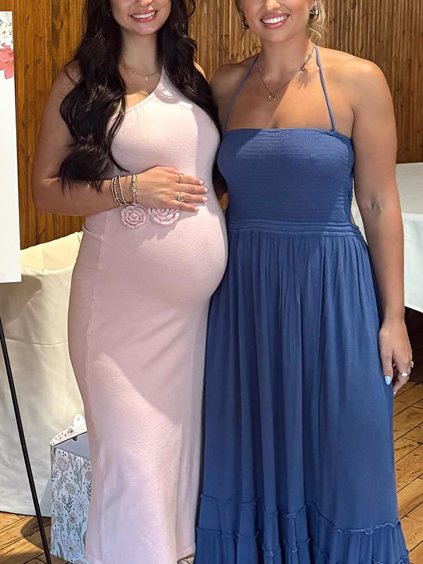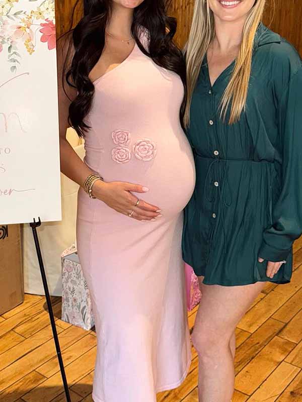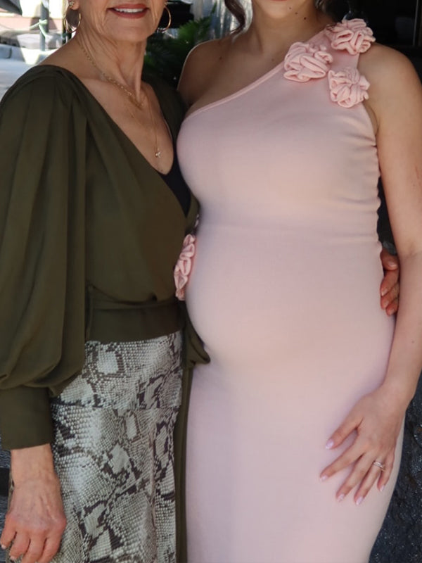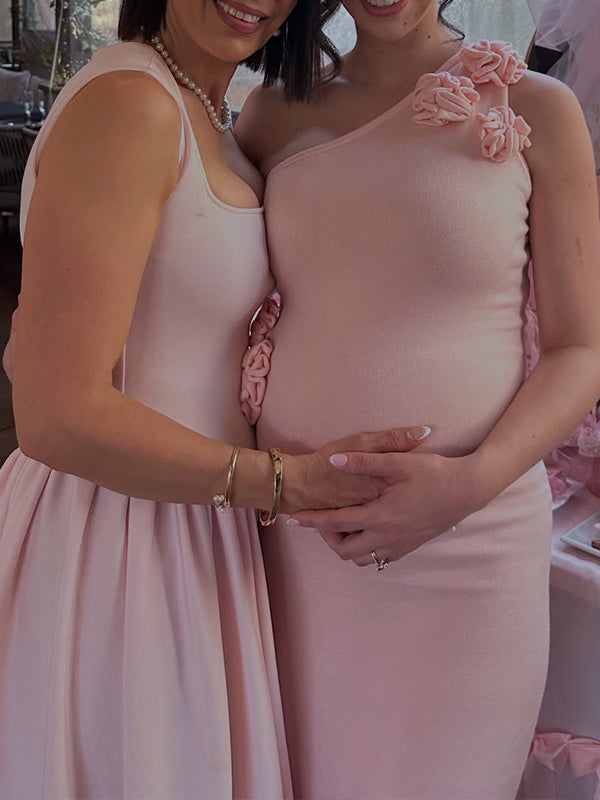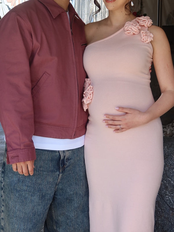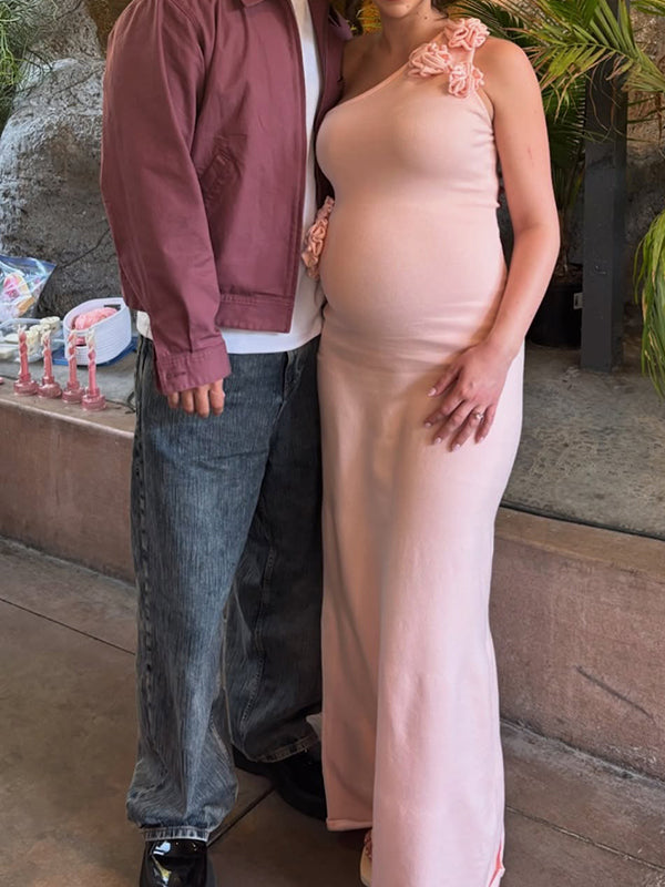 fotobeyou Pink Knit 3D Flowers One Shoulder Mermaid Maternity Maxi Dress