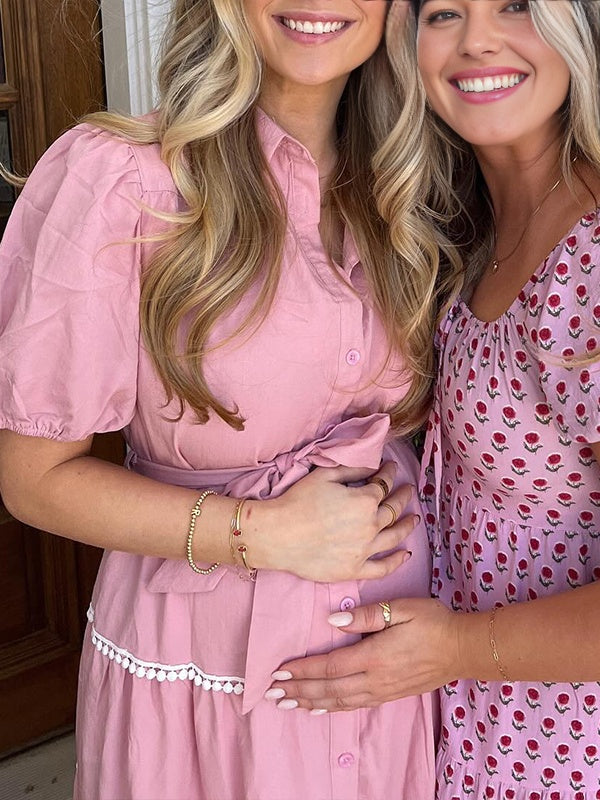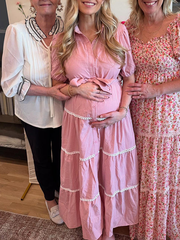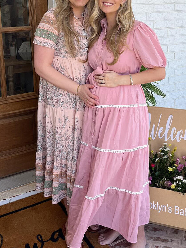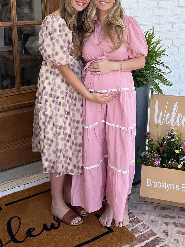 fotobeyou Pink Lace-up Buttons Ruched Puff Sleeve Daily Going out Baby Shower Maternity Photoshoot Maxi Dress