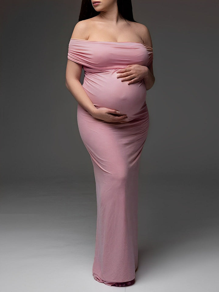 fotobeyou Pink Off Shoulder Belly Friendly Ruched Boat Neck Bodycon Photoshoot Maternity Maxi Dress