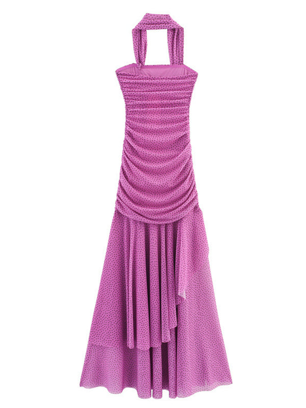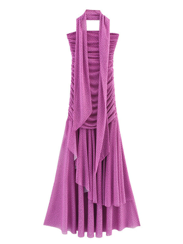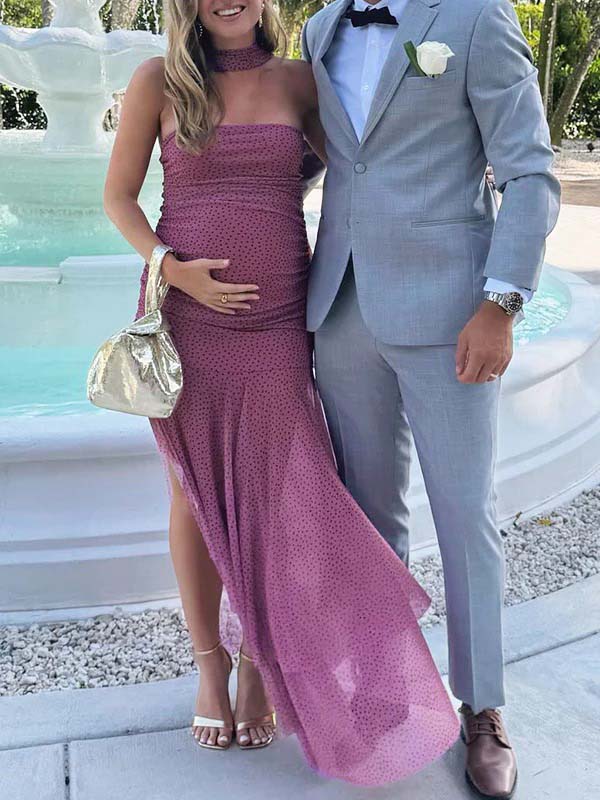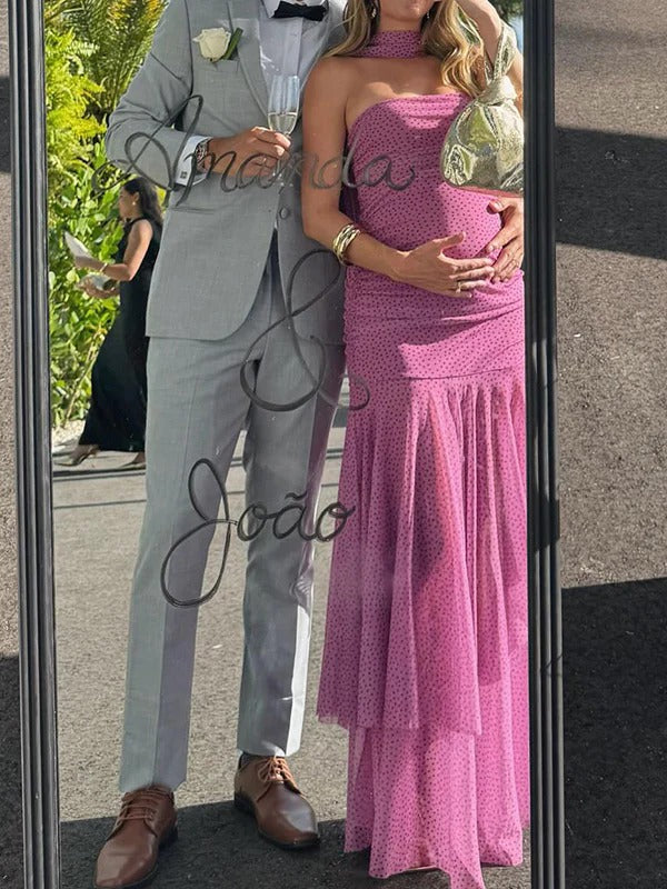 fotobeyou Pink Polka Dot Ruched Ruffle Bandeau Scarf Maternity Maxi Dress
