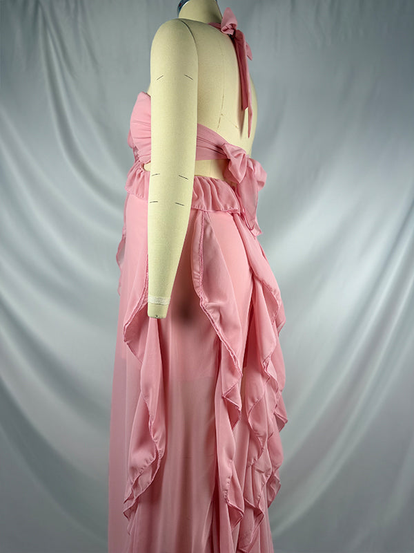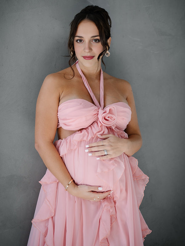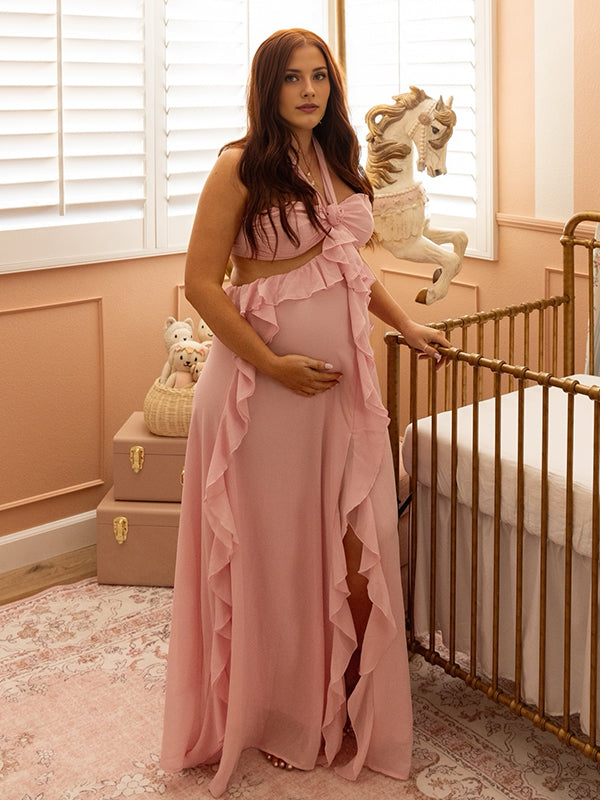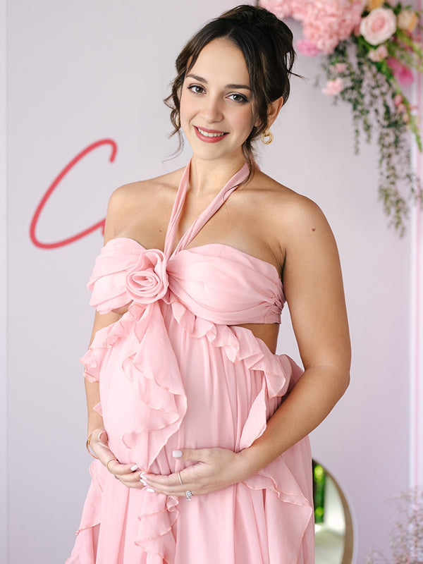 fotobeyou Pink Ruffle 3D Flower Cut Out Halter Neck Elegant Maternity Maxi Dress