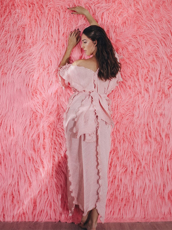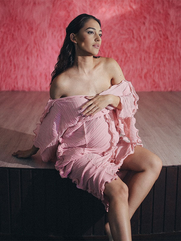 fotobeyou Pink Ruffle Off Shoulder V-neck Belted Photoshoot Baby Shower Maternity Maxi Dress