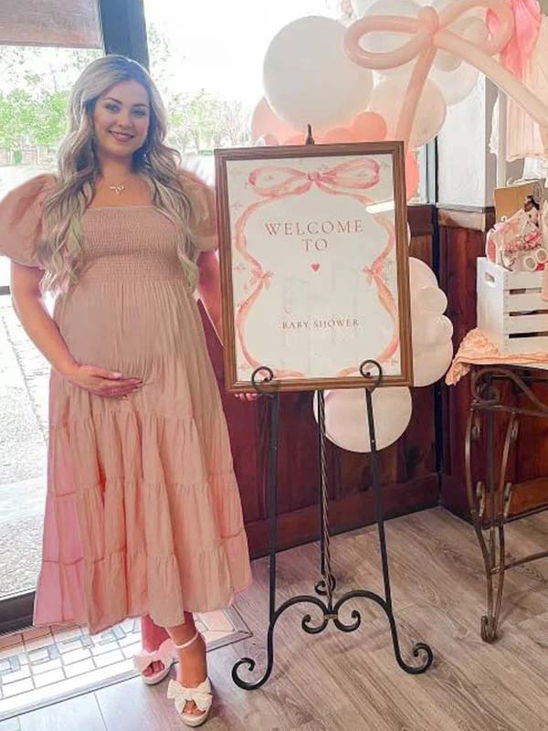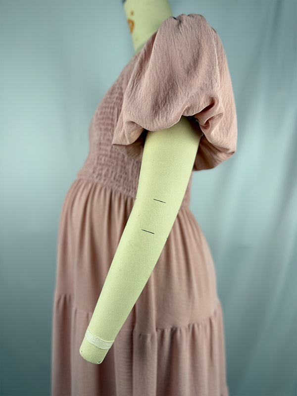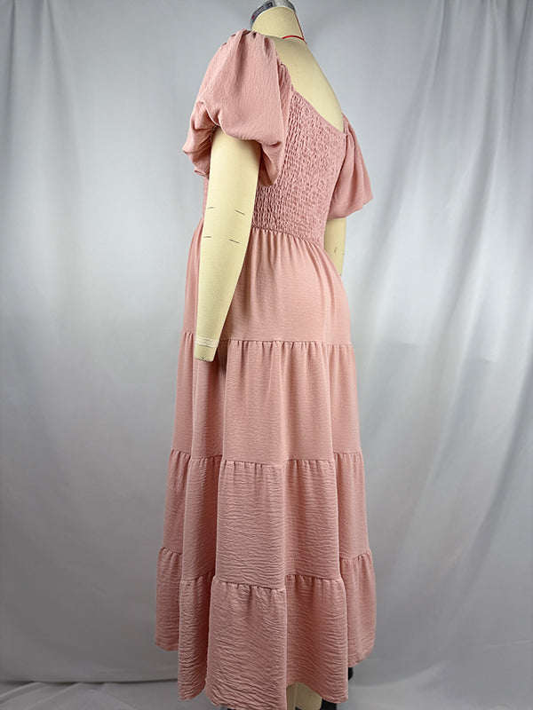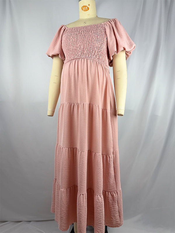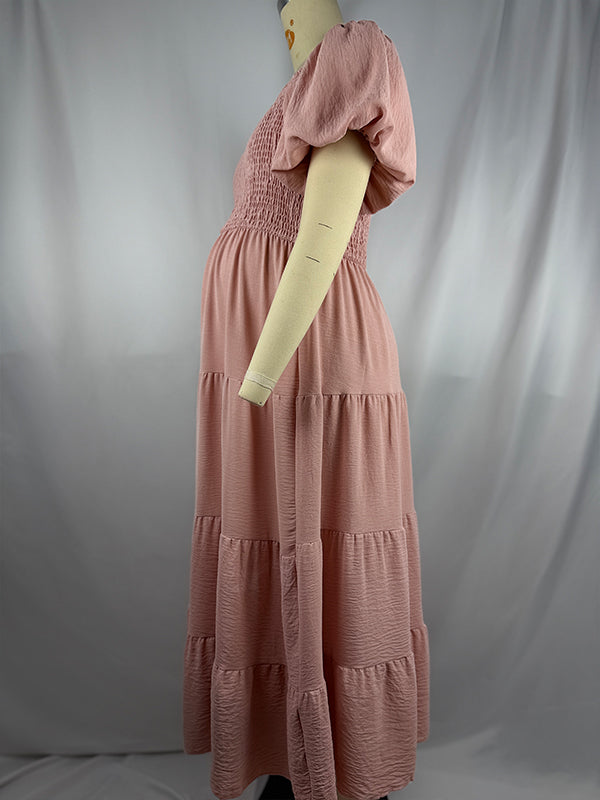 fotobeyou Pink Smocked Square Neck A-line Puff Sleeve Sweet Maternity Baby Shower Maxi Dress