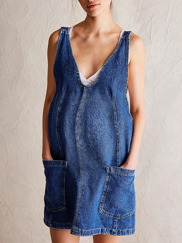 fotobeyou Pockets Buckle Denim Overall Skirt A-Line Daily Maternity Mini Dresses