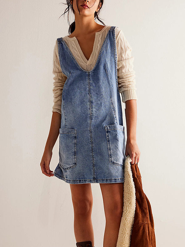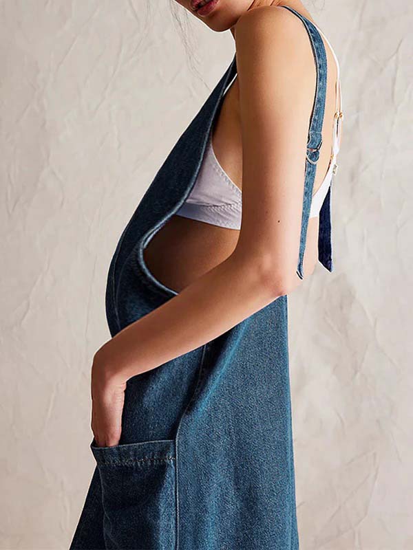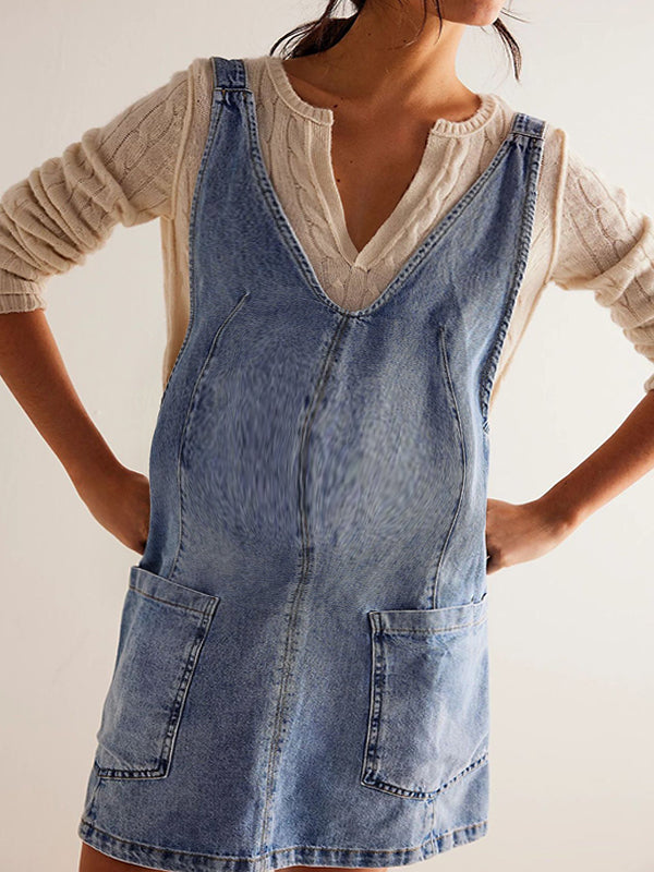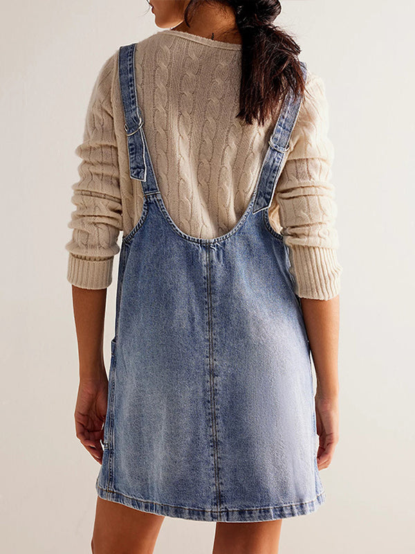 Decoration: Pockets buckle denim overall skirt a-line