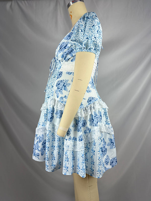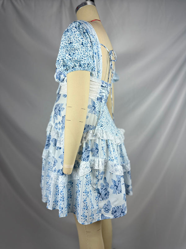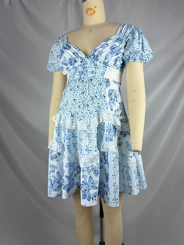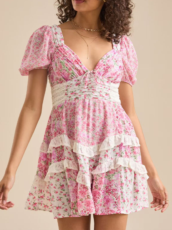 fotobeyou Puff Sleeve V-neck Flowers Tiered Lace Sweet Maternity Baby Shower Mini Dress