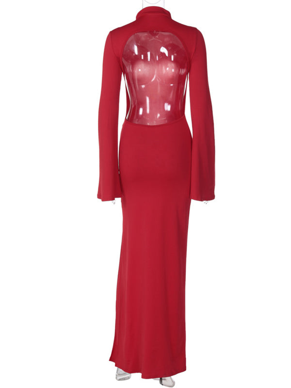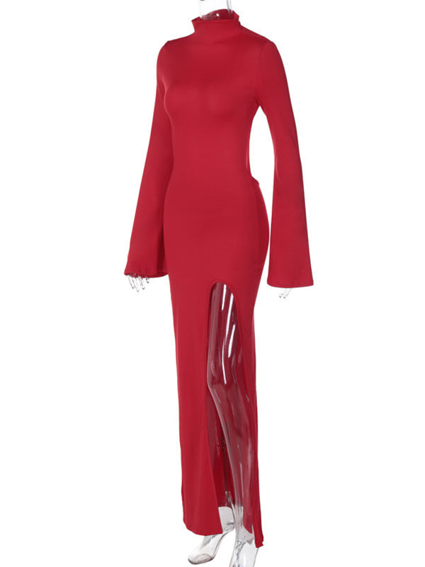 fotobeyou Red Backless Side Slit Bodycon Flare Sleeve Chic Photoshoot Maternity Maxi Dress
