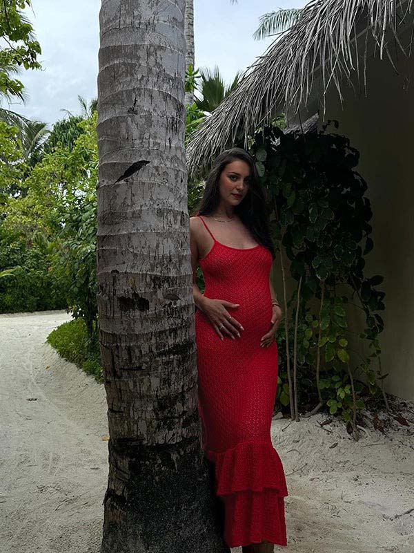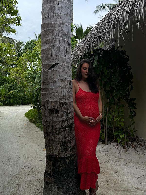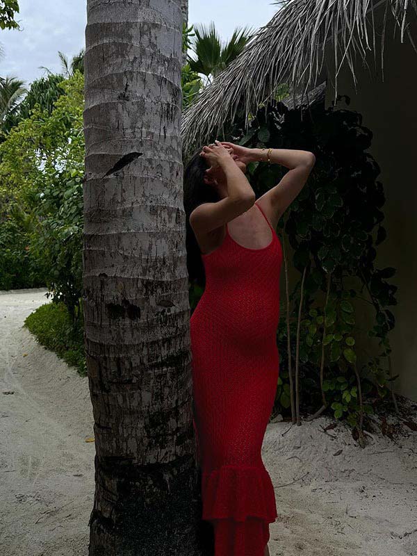 fotobeyou Red Crochet Hollow Out Ruffle Falbala Frill Hem Cami Bodycon Elegant Baby Moon Beach Maternity Photoshoot Baby Shower Mini Dress