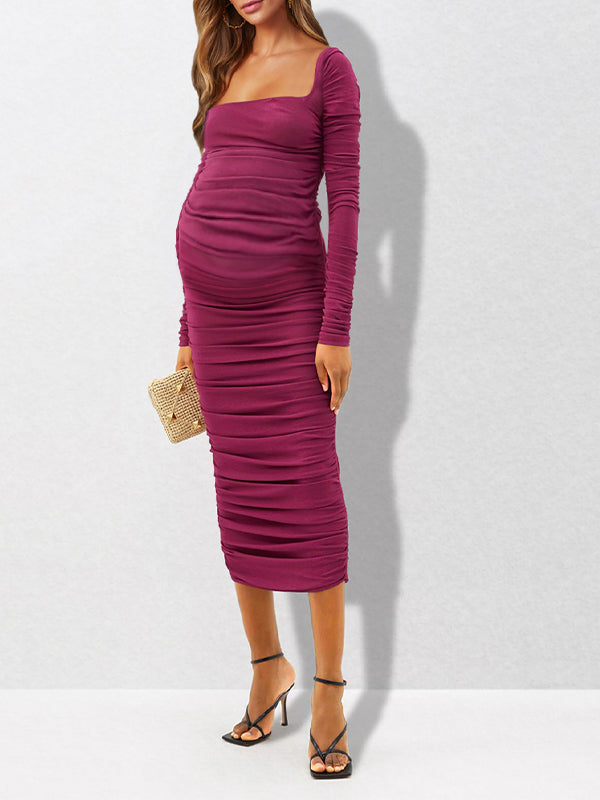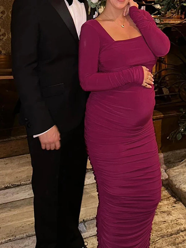 fotobeyou Rose Carmine Ruched Square Neck Bodycon Elegant Party Baby Shower Maternity Maxi Dress