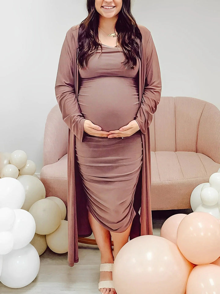 fotobeyou Ruched Cowl Neck Two Piece Spaghetti Strap Long Dress And Duster Coat Long Sleeve Babyshower Maternity Maxi Dress