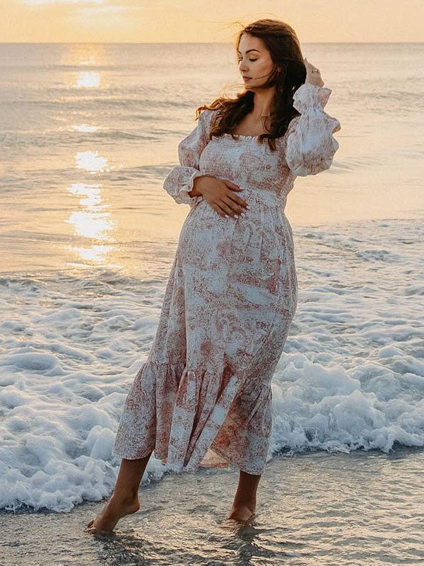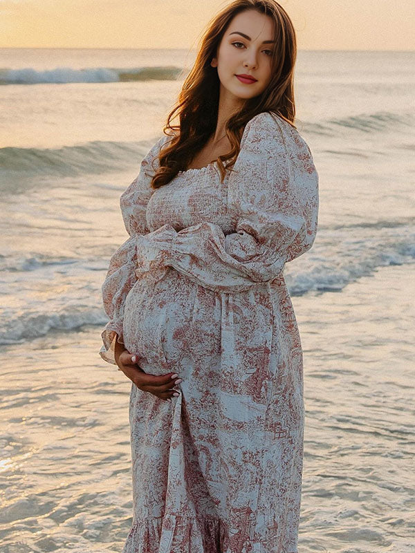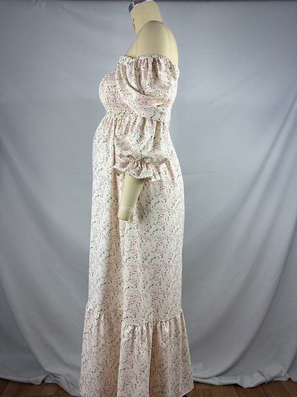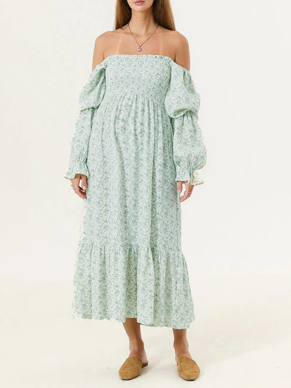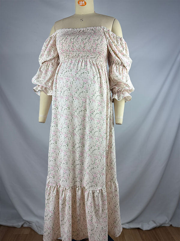 fotobeyou Ruffle Ruched High Waist Puff Sleeve Cute Gender Reveal Maternity Maxi Dress