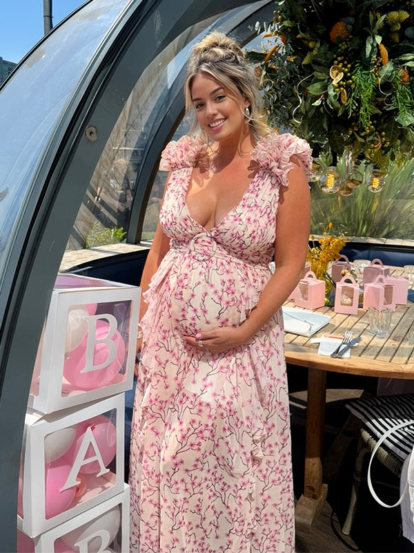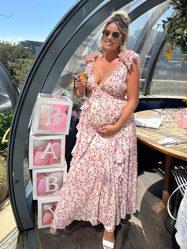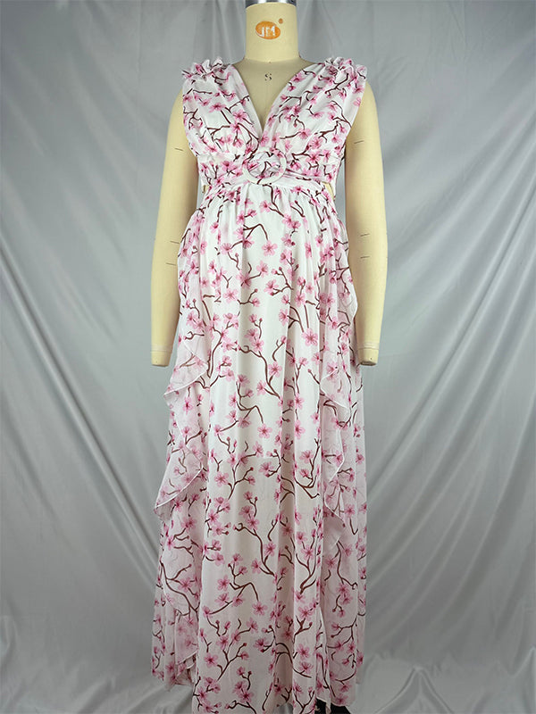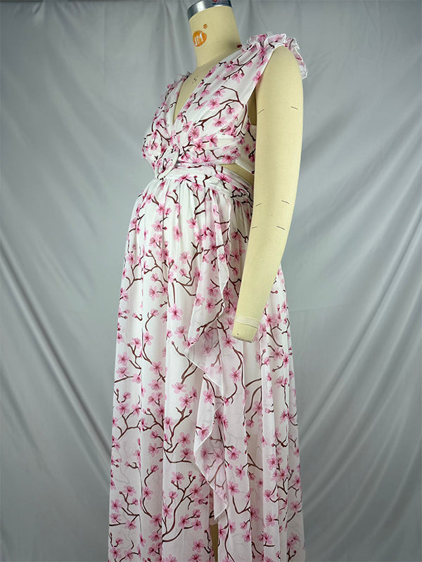 fotobeyou Ruffle Tutu Cut Out Back Tie Deep V-neck Flowy Baby Shower Maternity Maxi Dress