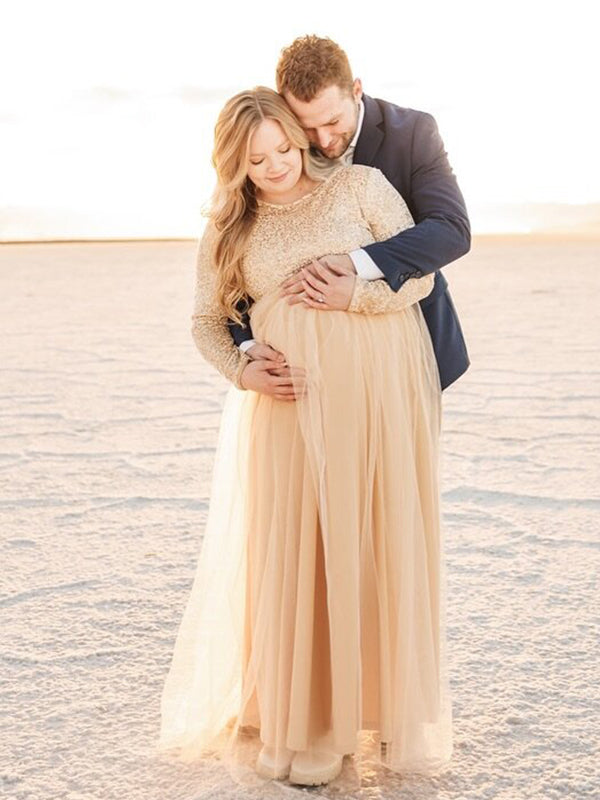 fotobeyou Sequin Tulle Splicing Long Sleeve Maternity Gender Reveal Maxi Dress