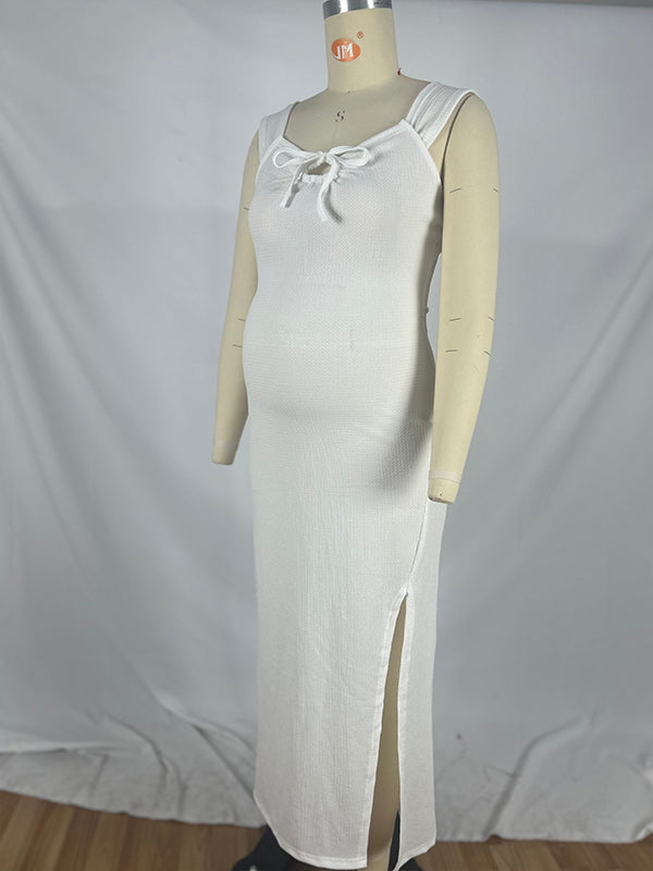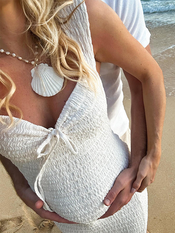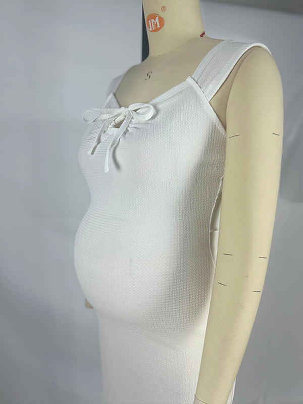 fotobeyou Smocked Bow Tie Side Slit Elegant Bodycon Vacation Beach Photoshoot Cute Baby Shower Maternity Maxi Dress