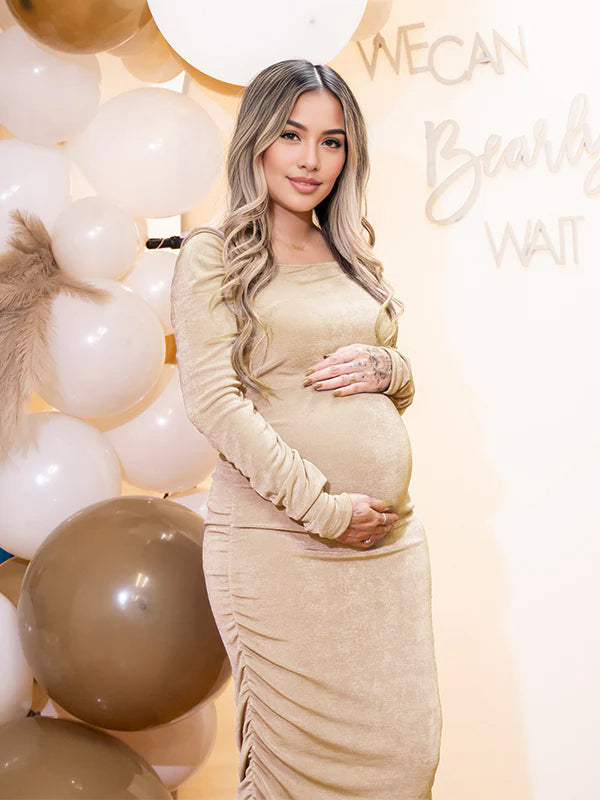 fotobeyou Solid Color Cascading Ruffle U-Neck Long Sleeve Bodycon Elegant Going Out Gowns Cute Bandage Baby Shower Maternity Maxi Dress