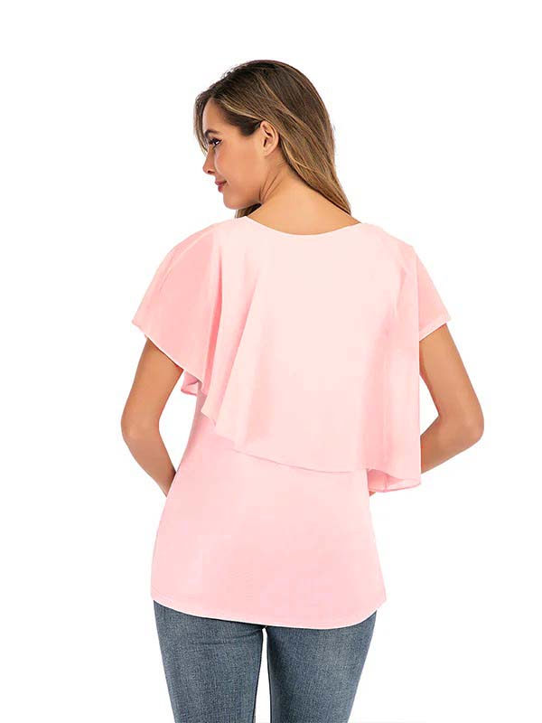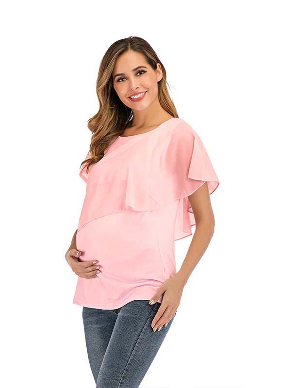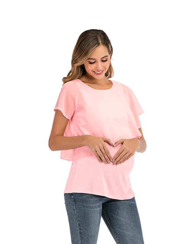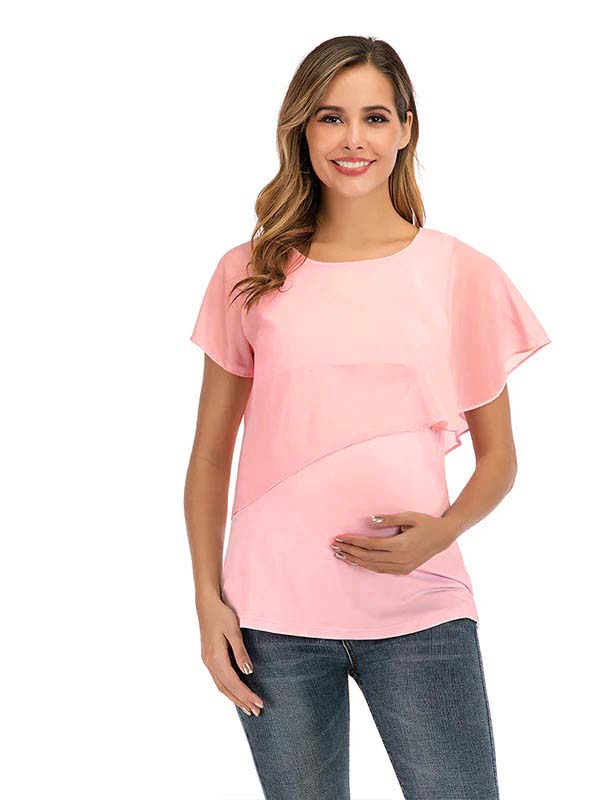 fotobeyou Solid Color Chiffon Ruffle Falbala Round Neck Short Sleeve Breastfeeding T-shirt Basic Going Out Daily Maternity Nursing Top